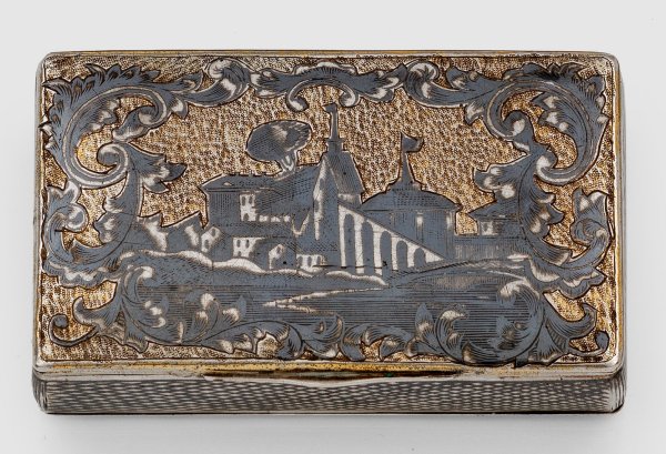 Silber. Rechteckiger Korpus mit Niello-Dekor in Form von Akanthusranken. Auf scharniertem Deckel und Boden unterschiedliche Stadtansichten vor fein punziertem Grund. Gest. 84, Beschauzeichen mit Dat., ungedeutetes Meisterzeichen "ee". Gew. ca. 85 g. H. 1,7 cm. 5 cm x 8 cm.