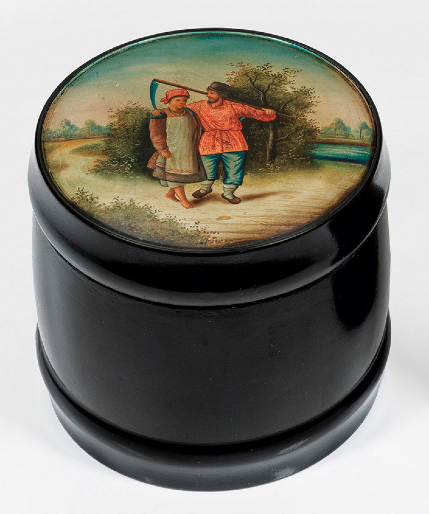 Pappmaché, schwarz lackiert. Hoher, fassförmiger Korpus. Auf dem Steckdeckel baumbestandene Landschaft mit einem Bauernpaar. Polychrome Lackmalerei. Innen mit Zinnfolie ausgeschlagen. Herstellerzeichen. H. 11,5 cm. D. 12,5 cm.