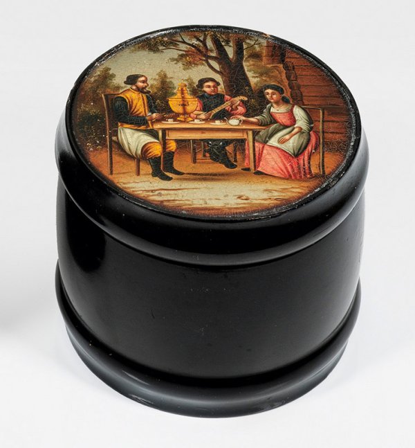Pappmaché, schwarz lackiert. Hoher, fassförmiger Korpus. Auf dem Steckdeckel baumbestandene Landschaft mit zwei Männern und einer Frau beim Teetrinken und Musizieren. Polychrome Lackmalerei. Innen mit Zinnfolie ausgeschlagen. Teilw. undeutl. Herstellerzeichen. H. 10,5 cm. D. 11,5 cm.