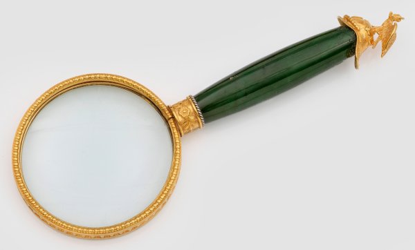 im Stil von Karl Fabergé. Nephrit, Silber, vergoldet. Mit Eierstabdekor gerahmtes Glas, leicht balusterförmiger Griff aus grünem Nephrit und Abschlussknauf in Form eines plastisch ausgearbeiteten Doppeladlers auf einem Helm. Originalschatulle. Gest. 88. L. 17 cm. D. 6,5 cm.