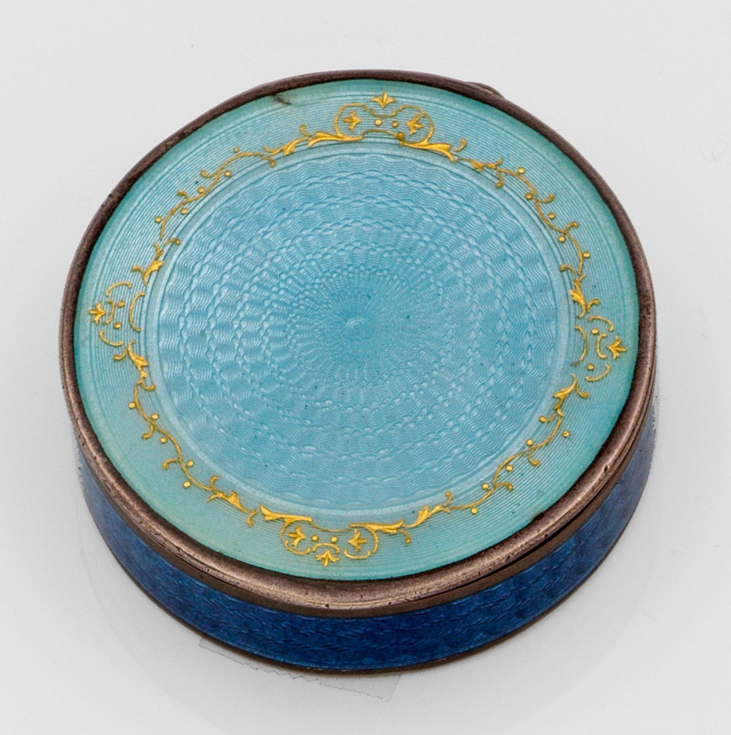im Stil von Karl Fabergé. Silber, teilw. emailliert. Runde Form mit flachem Deckel. Deckel weiß emailliert und strahlenförmig guillochiert, gerahmt von umlaufendem, goldenem Volutenkranz. Die Wandung hellblau emailliert. Deckel innen vergoldet. Gest. 84 sowie 925. Gew. ca. 60 g. H. 1 cm. D. 4,3 cm.