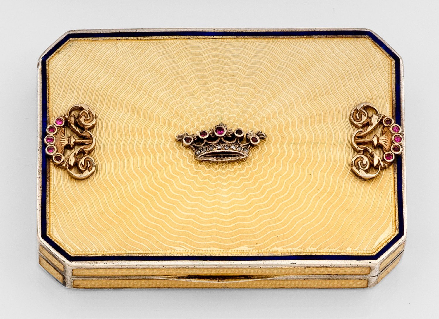 Silber, vergoldet und emailliert. Rechteckiger Korpus mit gekanteten Ecken. Flächen ecrufarben emailliert und wellenförmig guillochiert. Deckel mit zentral applizierter Adelskrone und seitlichen, volutenverzierten Vasen, ausgefasst mit Diamantrosen und Granatcabochons. Gest. Beschauzeichen, unidentifiziertes Meisterzeichen "PB". Ber.; Gew. ca. 110 g. H. 1,5 cm. 5,2 cm x 7,2 cm.
