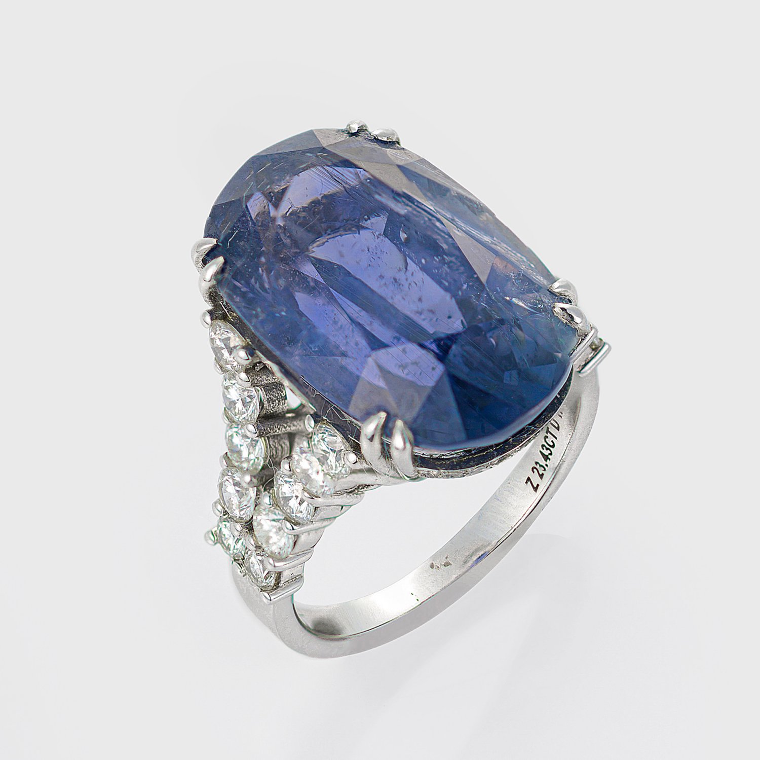 Weißgold, gest. 750. Zentral besetzt mit einem unbehandelten, daylightblue zu violettfarben changierendem Saphir von ca. 23,43 ct., flankiert von Brillanten von zus. ca. 1,53 ct. (H/vs-si). Gew. ca. 11,80 g.