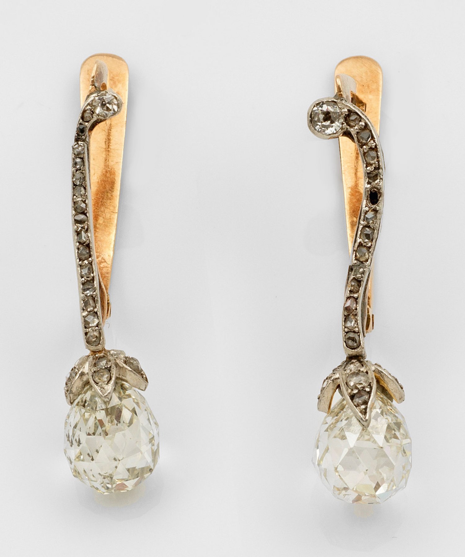 Roségold, 14 ct. mit Silber verbödet. Volutenartig gestalteter Ohrring, schauseitig besetzt mit Diamantrosen und abschließend 2 Diamanten im Briolettschliff von 2,52 ct. (J/si2) und 2,63 ct. (I/si1). Ges.-Gew. ca. 4,45 g.