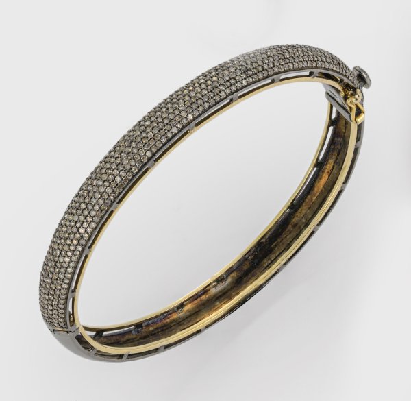 Gelbgold, gest. 585 und Silber, gest. 925. Schauseitig besetzt mit Altschliffdiamanten von zus. ca. 2,50 ct. in Pavéfassung. Gew. ca. 17,25 g.
