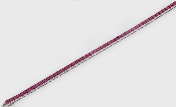 Weißgold, gest. 750. Linear besetzt mit taubenblutroten Rubinen von zus. ca. 11,78 ct. im Carréeschliff. L. 18 cm. Gew. ca. 13,09 g.