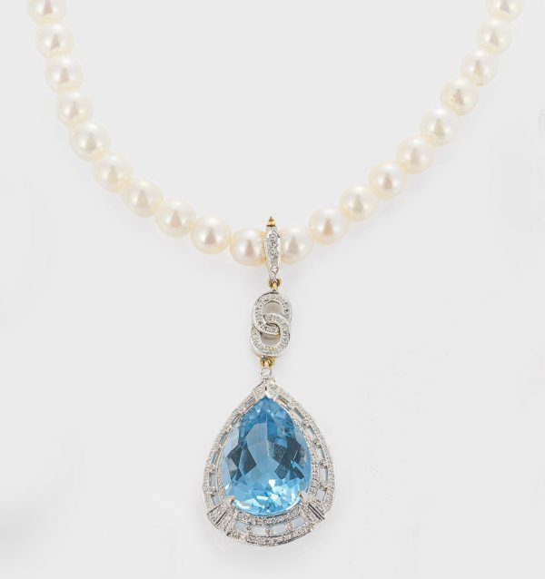 Gelb- und Weißgold, 18 ct.; Einreihige Kette aus schneeweißen Zuchtperlen von ca. 6,5 mm in sehr feinem, rosé-grün changierendem Lüster. Zentraler Anhänger mit einem Topas von ca. 21 x 16 x 11 mm im Pendeloqueschliff, entouriert von kleinen Diamanten. L. ca. 41,5 cm. Gew. ca. 39,41 g.
