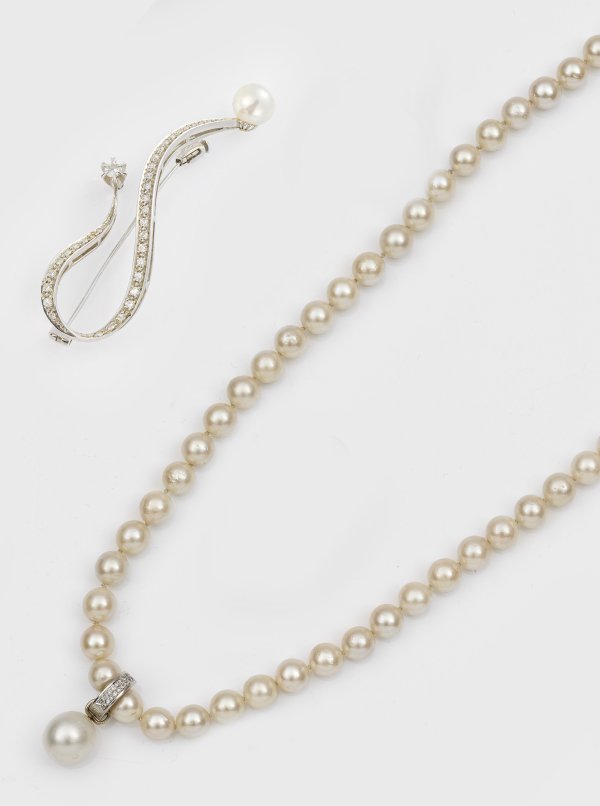 Collier mit Anhänger und Brosche. Weißgold, gest. 750 und 14 k. Einreihige Kette mit cremefarbenen Perlen von ca. 8 mm in farbintensivem, rosé-grün changierendem Lüster. Brosche besetzt mit einer silberfarbenen Perle von ca. 8 mm, einem Altschliffdiamanten von ca. 0,10 ct. und 8/8 Diamanten. Anhänger besetzt mit einer weißen Südseeperle von ca. 12 mm. Ges.-Gew. ca. 92,01 g.