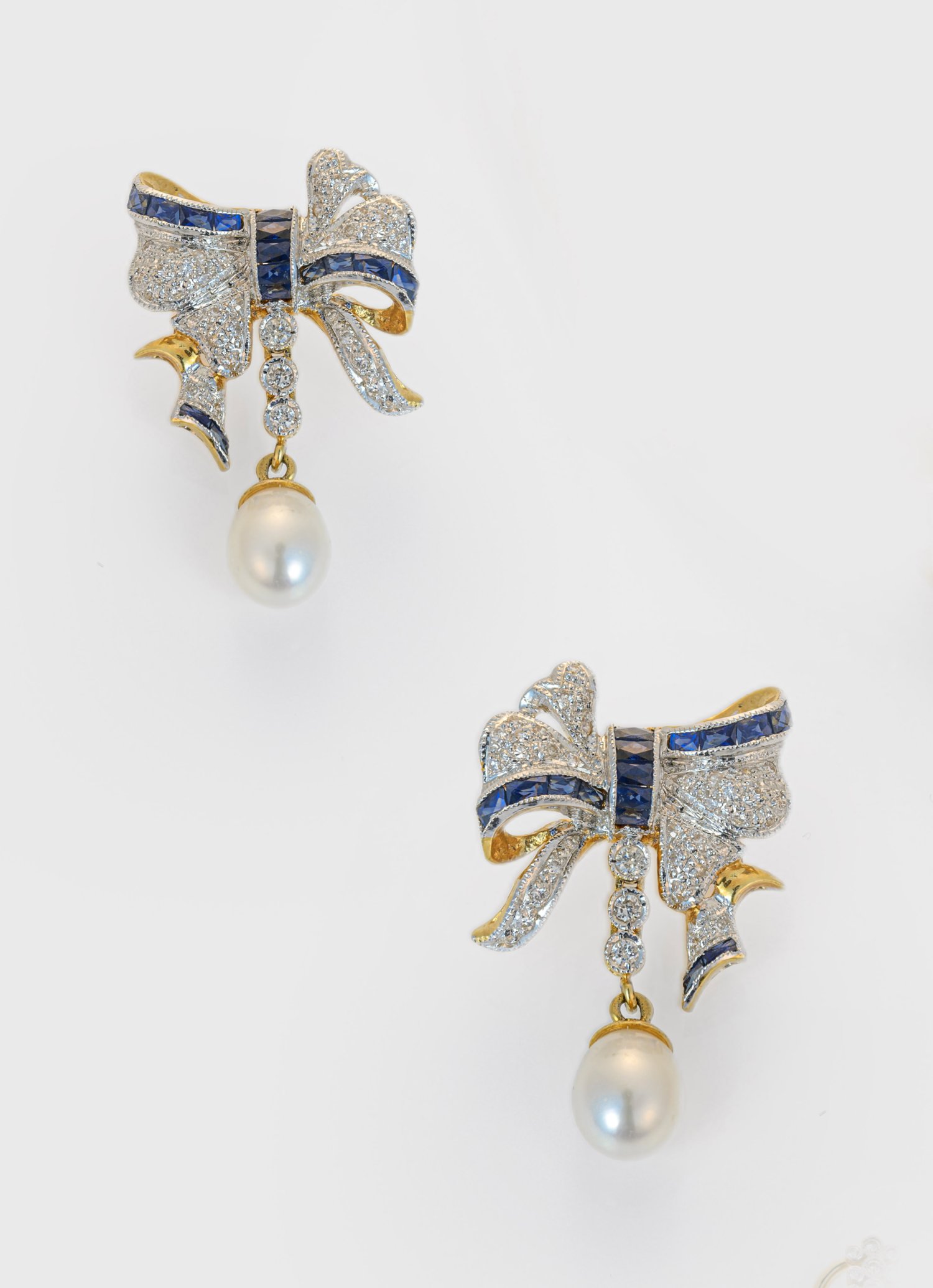 Gelbgold, gest. 750. Schleifenbrisur besetzt mit Saphiren von zus. ca. 0,95 ct., Brillanten von ca. 0,45 ct. und jeweils eine weiße, tropfenförmige Perle von ca. 7 mm mit rosé-grün changierendem Lüster. Ges.-Gew. ca. 13,67 g.
