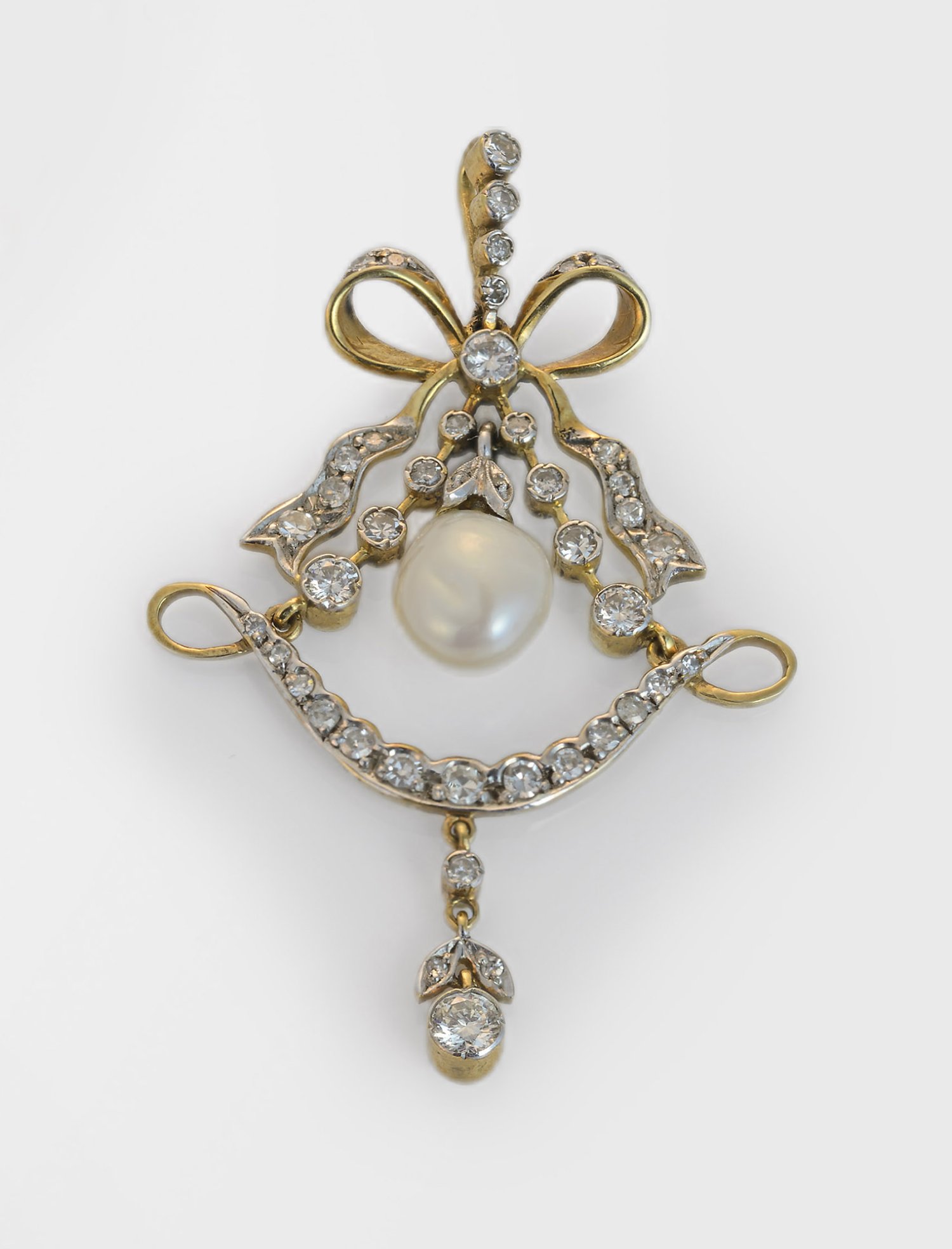 Gelbgold, 14 k. Schauseitig besetzt mit Altschliffdiamanten, 8/8 Diamanten, akzentuiert von einer weißen Barock-Perle von ca. 8 mm, in feinem, roségrün changierendem Lüster. Feine Ajour-Arbeit. Gew. ca. 4,51 g.