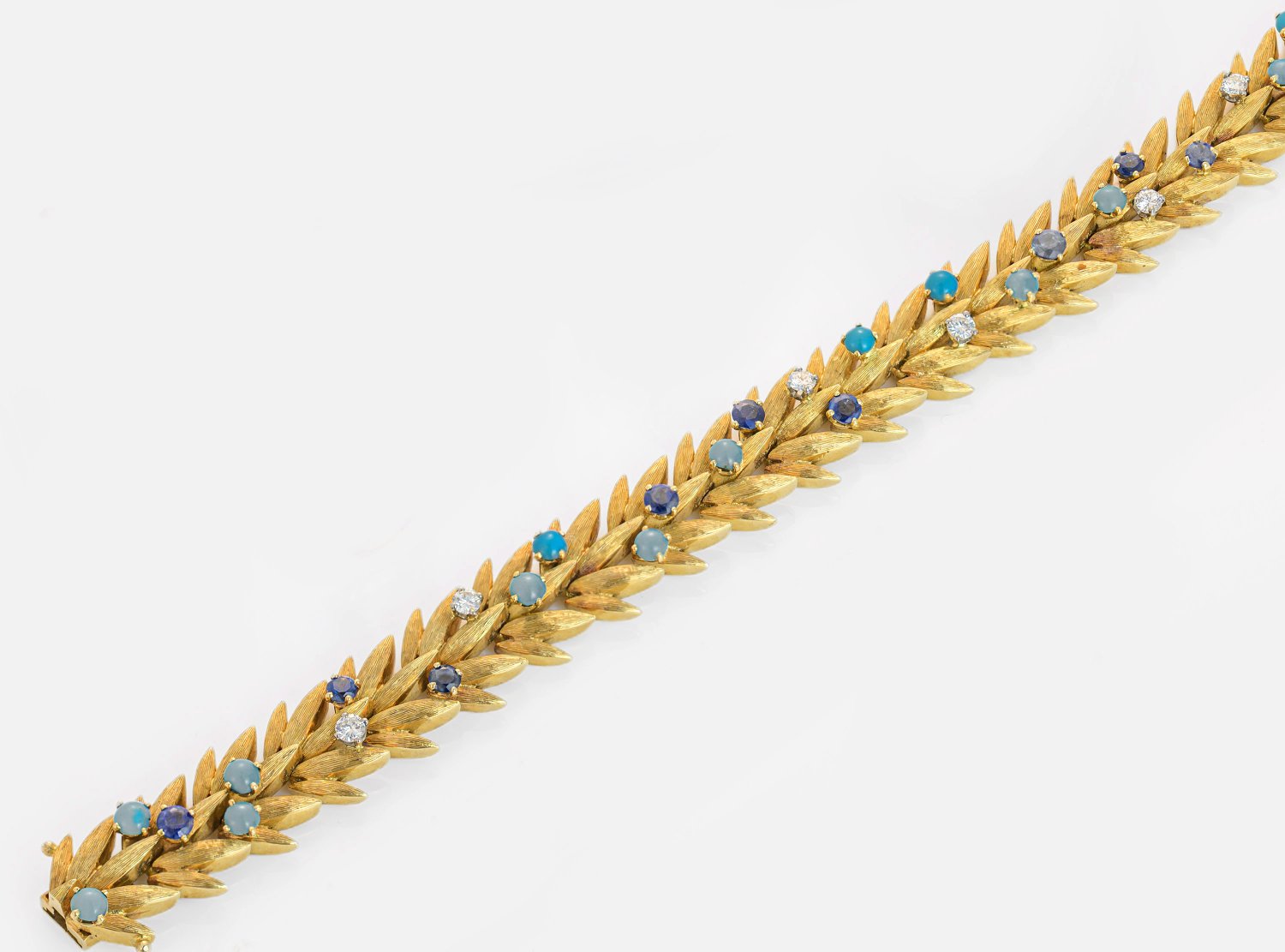Gelbgold, gest. 750. Satinierte, blütenförmige Glieder, besetzt mit Brillanten von zus. ca. 0,60 ct., Saphiren von zus. ca. 1,10 ct. und Türkis-Cabochons. L. ca. 18,5 cm. Gew. ca. 80,04 g.