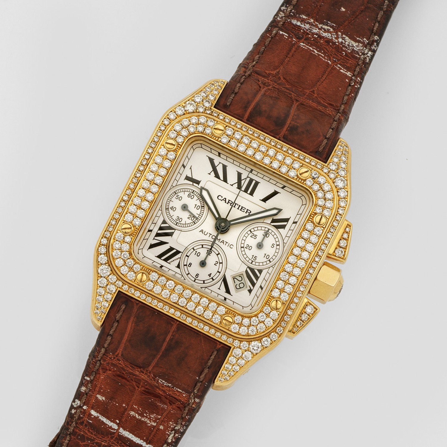 Gelbgold, gest. 750. Quadratisches Uhrengehäuse mit verschraubter Lünette, original Cartier-Diamantbesatz in Pavéfassung. Silbergekörntes Zifferblatt, aufgelegte schwarze römische Zahlen und Alpha-Leuchtzeiger, Chronograph aus der Mitte, 30-Minuten und 12-Stunden Zähler, Datumsanzeige und kleine Sekunde. Automatikwerk. Cognacfarbenes Lederarmband mit doppelter Gold-Faltschließe. Herstellerzeichen. Ref.-Nr. 2741319845. Gew. 246,67 g. D. 40 mm. Original-Lederetui und Uhrenpass. Neupreis ca. € 70.000,-.