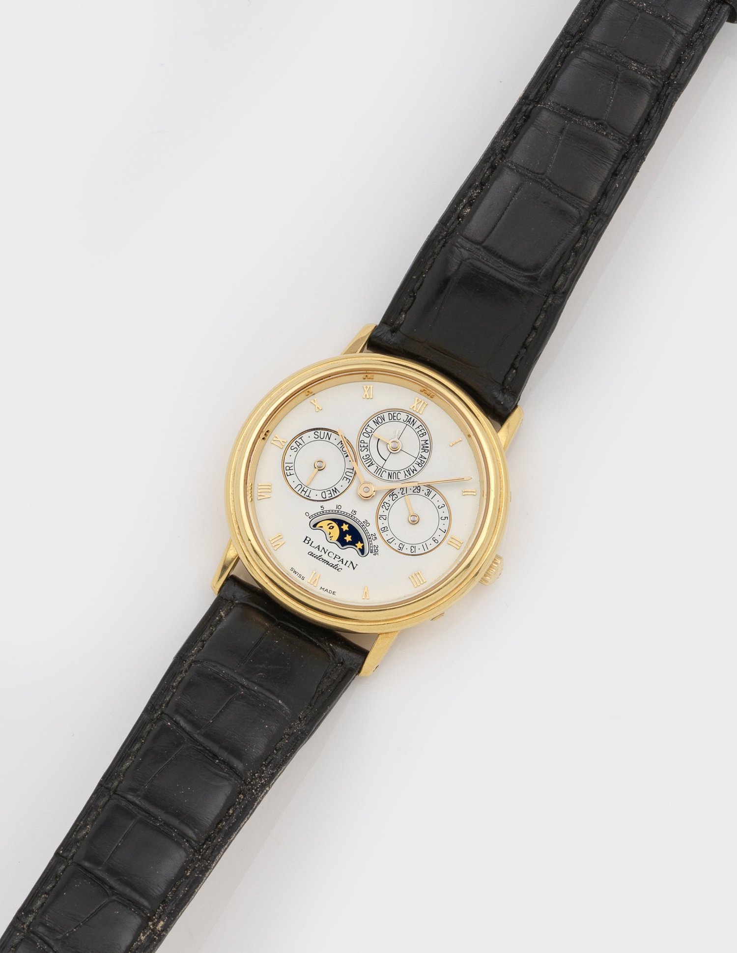 Gelbgold, gest. 750. Rundes Uhrengehäuse, weißes Zifferblatt mit römischen Indexen, Stab-Zeiger, Mondphase, Tag-, Monat- und Datumsanzeige. Schwarzgeprägtes Lederarmband. Mechanisches Werk mit Handaufzug. Ref.-Nr. 5494-1418 A58, Ind.-Nr. 195. Herstellerzeichen. D. 33 mm. Gew. ca. 52,51 g. Original Box und zweites neuwertiges Lederarmband.