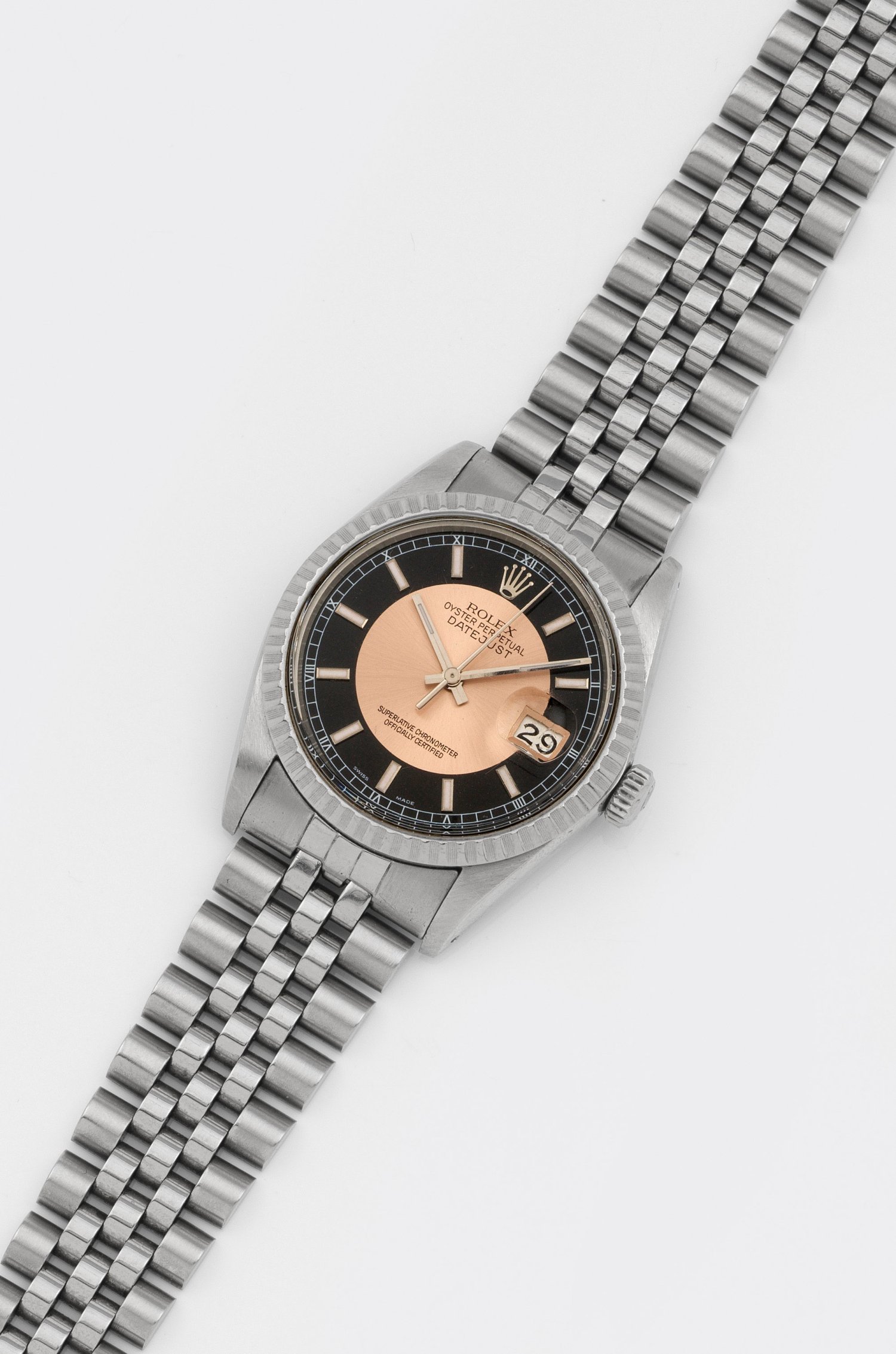 Stahl. Rundes Uhrengehäuse, geriffelte Lünette, schwarzes und satiniertes, roséfarbenes Zifferblatt mit römischen Indexen, bzw. Stabindexen mit Tritium-Auflage mit korrespondierenden Zeigern und Datumsanzeige. Saphirglas. Automatikwerk. Jubilee-Armband mit Faltschließe. Herstellerzeichen. D. 35 mm. Gew. ca. 88.92 g.