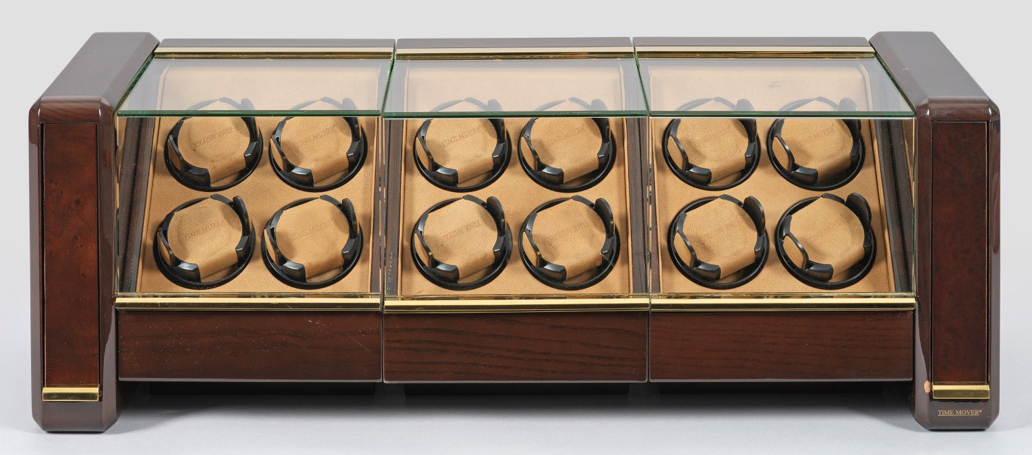 An Austrian Art Deco style wooden design watch winder for twelve and storage compartments for further six wristwatches. Electrified and battery powered. Original papers.