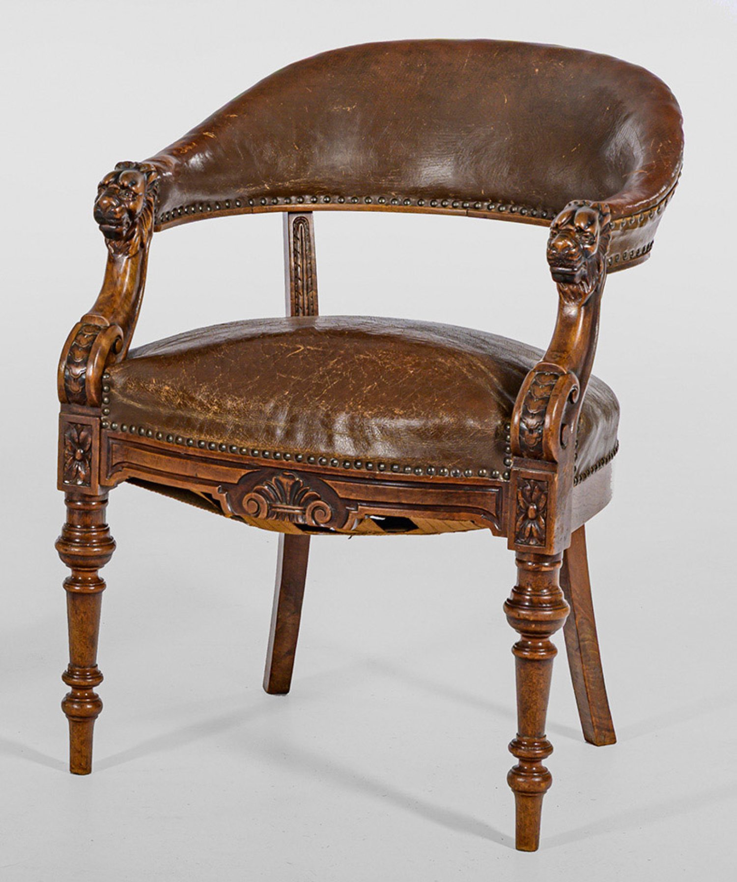 Mahagoni, teilw. reliefplastisch geschnitzt sowie braunes Leder. Bombierte Zarge auf mehrfach gegliederten Balusterbeinen. Volutenförmig angelegte Stützen mit plastischen Löwenmaskarons für gewölbte Rückenlehne. Sitz- und Lehnenfläche gepolstert und bezogen. H. 85 cm. 62 cm x 63 cm. Sitz-H. 50 cm.