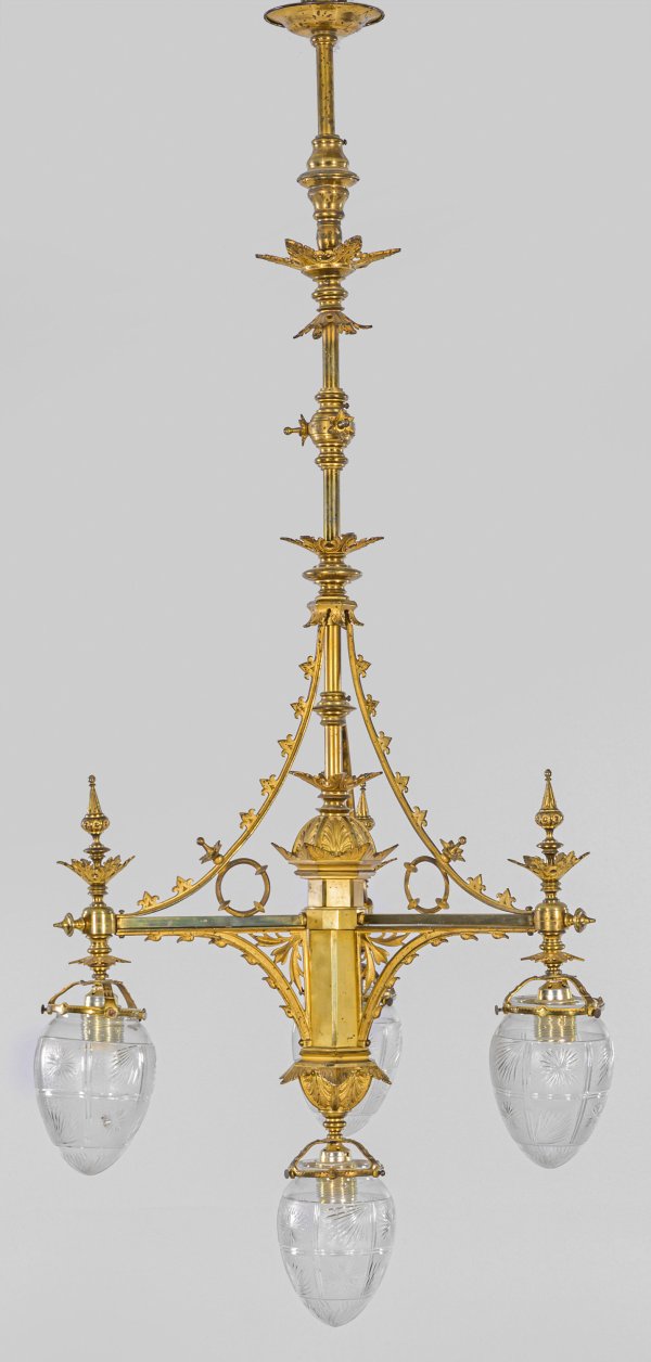 4-flg.; Messing, vergoldet und farbloses, teilw. satiniertes Glas. Gestreckter, mehrfach gegliederter Balusterschaft, flankiert von schlanken, ornamentierten Streben als Träger für Leuchtmittel mit tropfenförmigen, ornamentierten Lampenschirmen. Elektrifiziert. H. 120 cm. D. 46 cm.