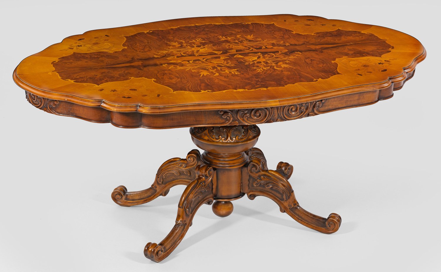 Nussbaum, reliefplastisch geschnitzt und furniert sowie Einlagen aus unterschiedlichen Hölzern. Kräftiger, mehrfach gegliederter Balusterschaft auf geschwungenen Volutenbeinen als Träger für passig geschweifte Zarge und gering überstehende, profilierte Deckplatte mit Floralintarsien. H. 73 cm. 178 cm x 110 cm.