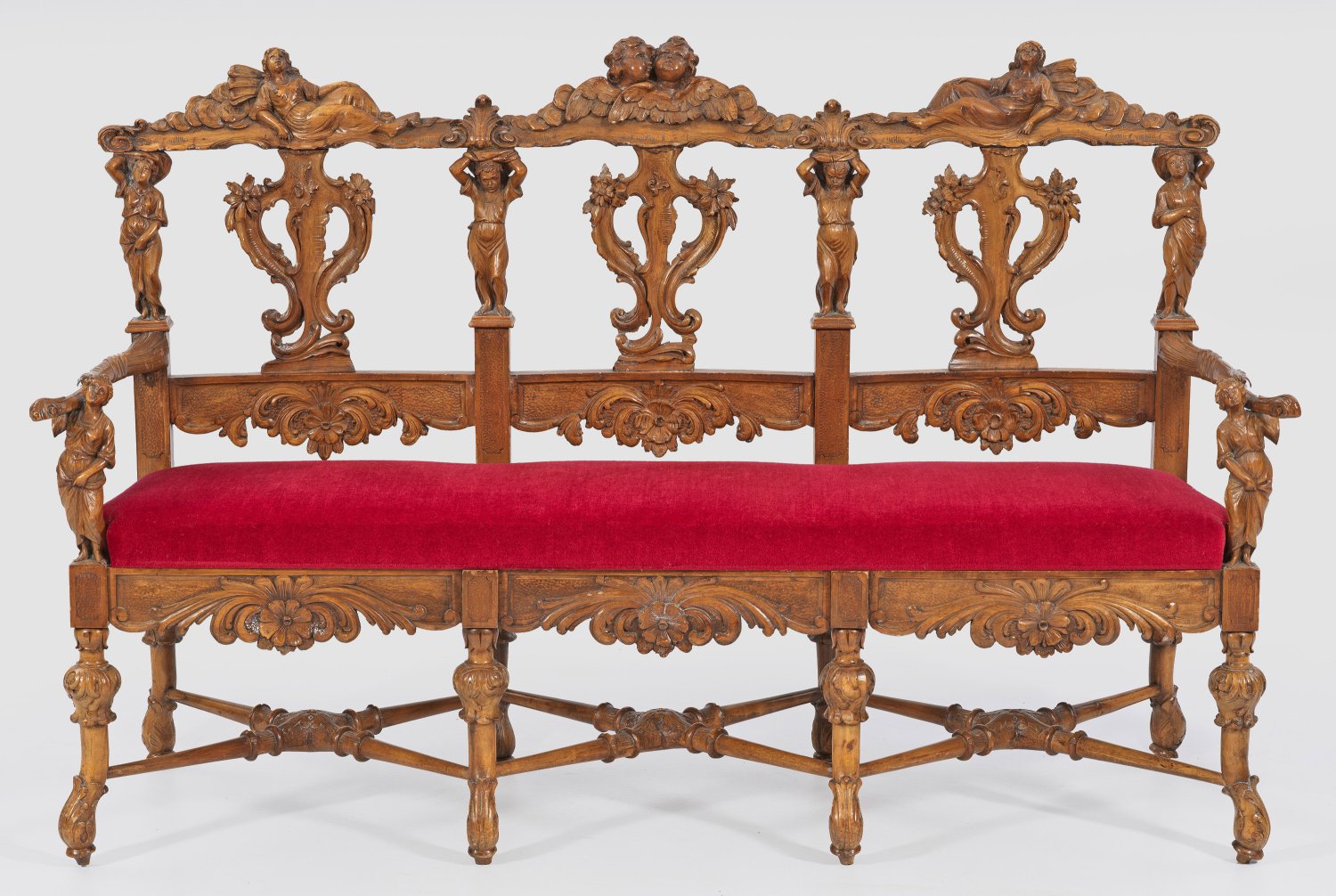 Nussbaum, plastisch geschnitzt. Gerade, trapezförmige Zarge mit reliefiertem Blattwerk auf geschwungenen Balusterbeinen, unterhalb durch kreuzförmig angelegte Stege verbunden. Figural gestaltete Stützen für schmale Armlehnen sowie korrespondierende Rückenlehnenrahmung mit balusterförmigen Mittelstegen, Karyatidenfiguren sowie geschweiftem oberen Abschluss aus Muschelwerk und Puttenköpfen. Sitzfläche gepolstert und bezogen. H. 113,5 cm. 176 cm x 55 cm. Sitz-H. 51 cm.