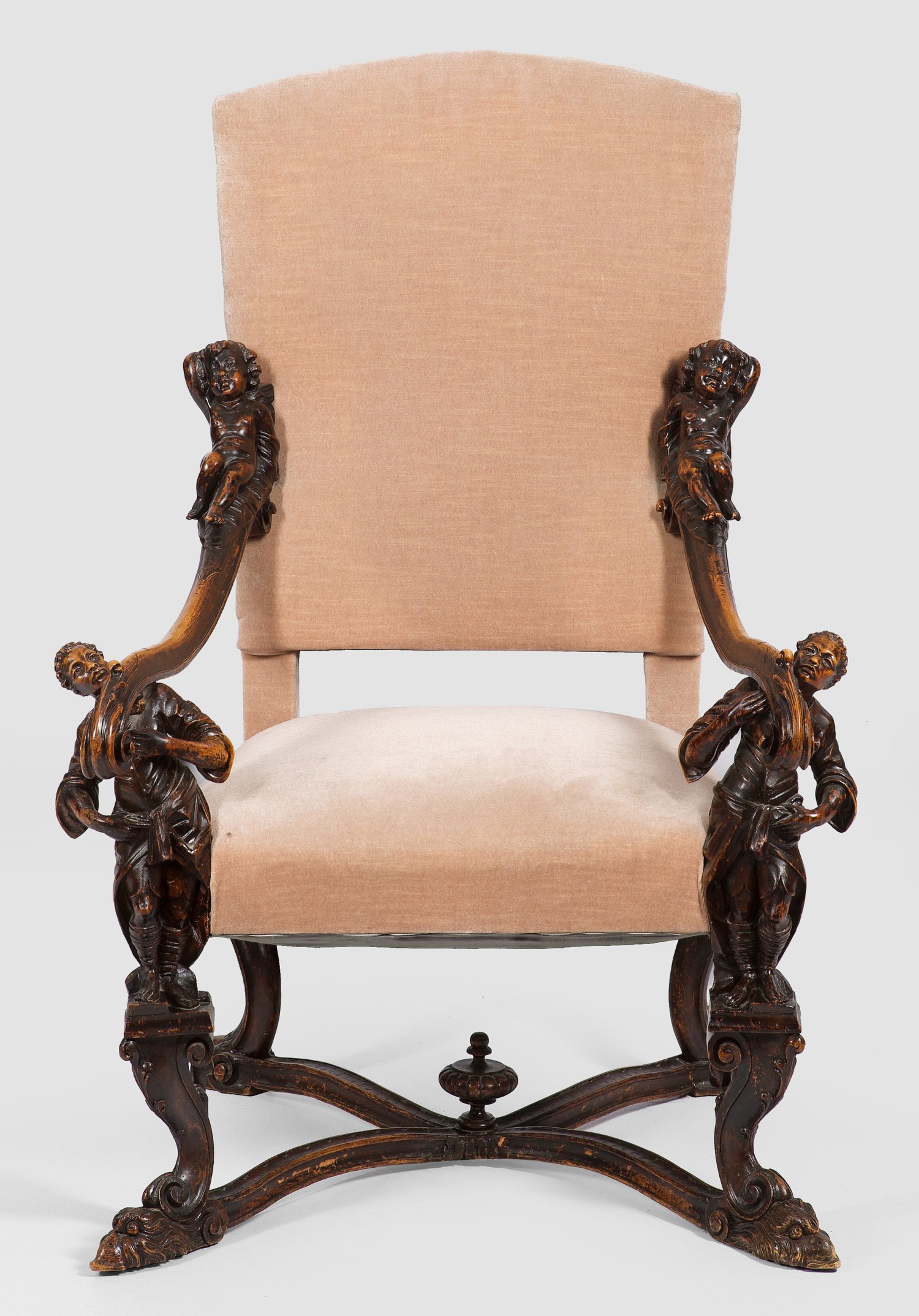 Nussbaum, plastisch geschnitzt und dunkel gebeizt. Trapezförmige Zarge auf Volutenbeinen und plastischen Greifen, unterhalb durch geschweifte Stege mit Vasenbekrönung verbunden. Vollplastisch gestaltete Mohrenfiguren als Stützen für geschweift ansteigende, volutenförmige Armlehnen mit plastischen Puttenbekrönungen. Hohe Rückenlehnenrahmung mit gewölbtem oberen Abschluss. Gepolstert und bezogen. H. 131 cm. 88 cm x 80 cm. Sitz-H. 47 cm.