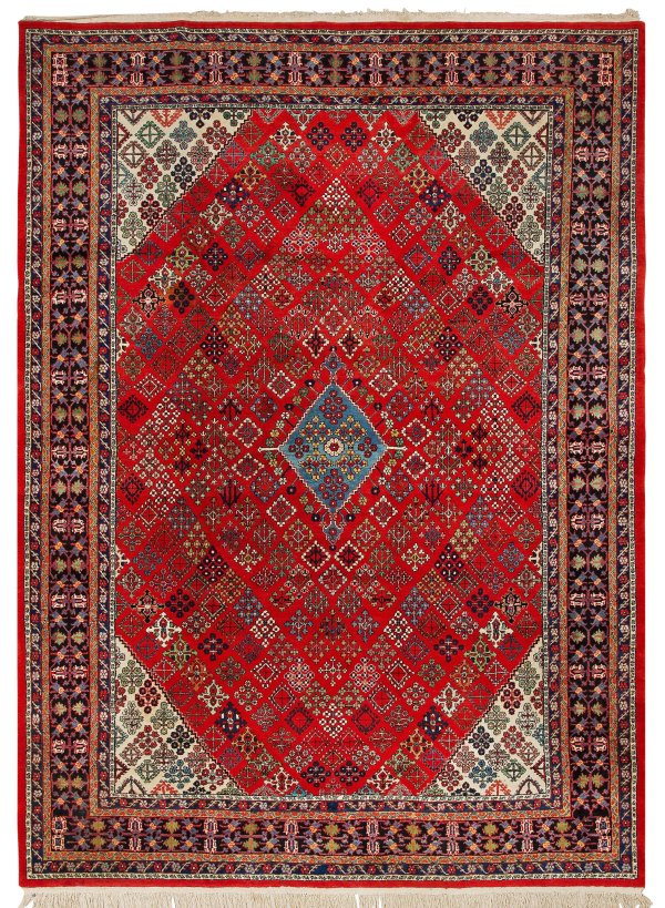 Persien. Wolle auf Baumwolle. Im roten Innenfeld hellblaues Rautenmedaillon sowie cremefarbene Ecklösungen. Flächendeckende Musterung aus rautenförmig angelegten Blütenmotiven im Rapport. Umlaufend dunkelgrundige Bordüre, begrenzt von schmalen Bändern. 260 cm x 357 cm.