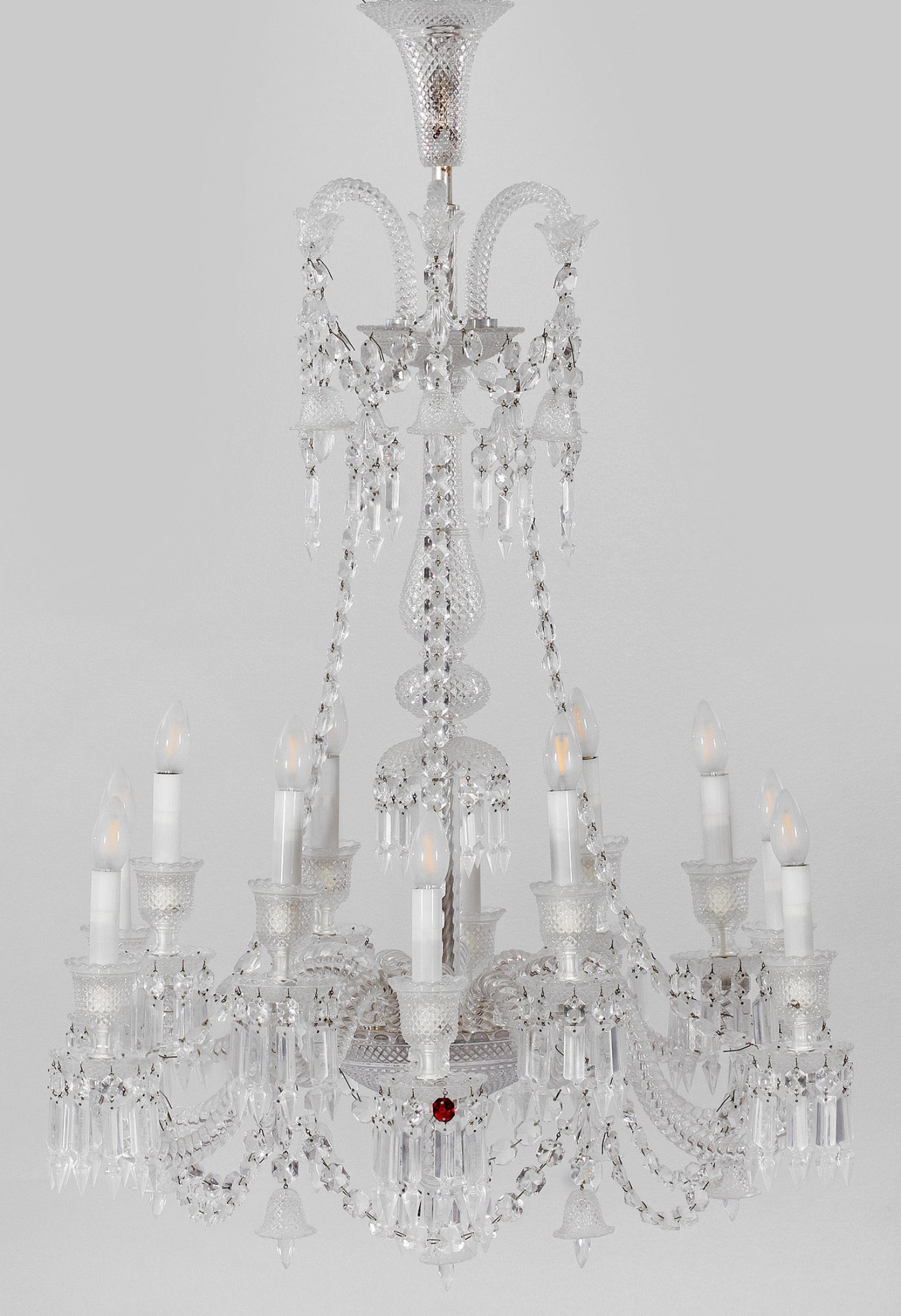 Serie No, 5. 12-flg.; Farbloses Kristallglas. Mehrfach gegliederter Balusterschaft. Unterhalb davon ausgehend stark geschwungene, in sich gedrehte Leuchterarme als Träger für Leuchtmittel. Tief gemuldete Traufschalen mit flächendeckendem Steinelschliff und kelchförmige Tüllen. Korrespondierender oberer Abschluss. Reicher Behang aus facettierten Prismenstäben, Glockenmotiven und Prismenschnüren. Herstellerzeichen in Form einer rubinroten Kristallprisma mit graviertem B. Elektrifiziert. H. 115 cm. D. 78 cm.