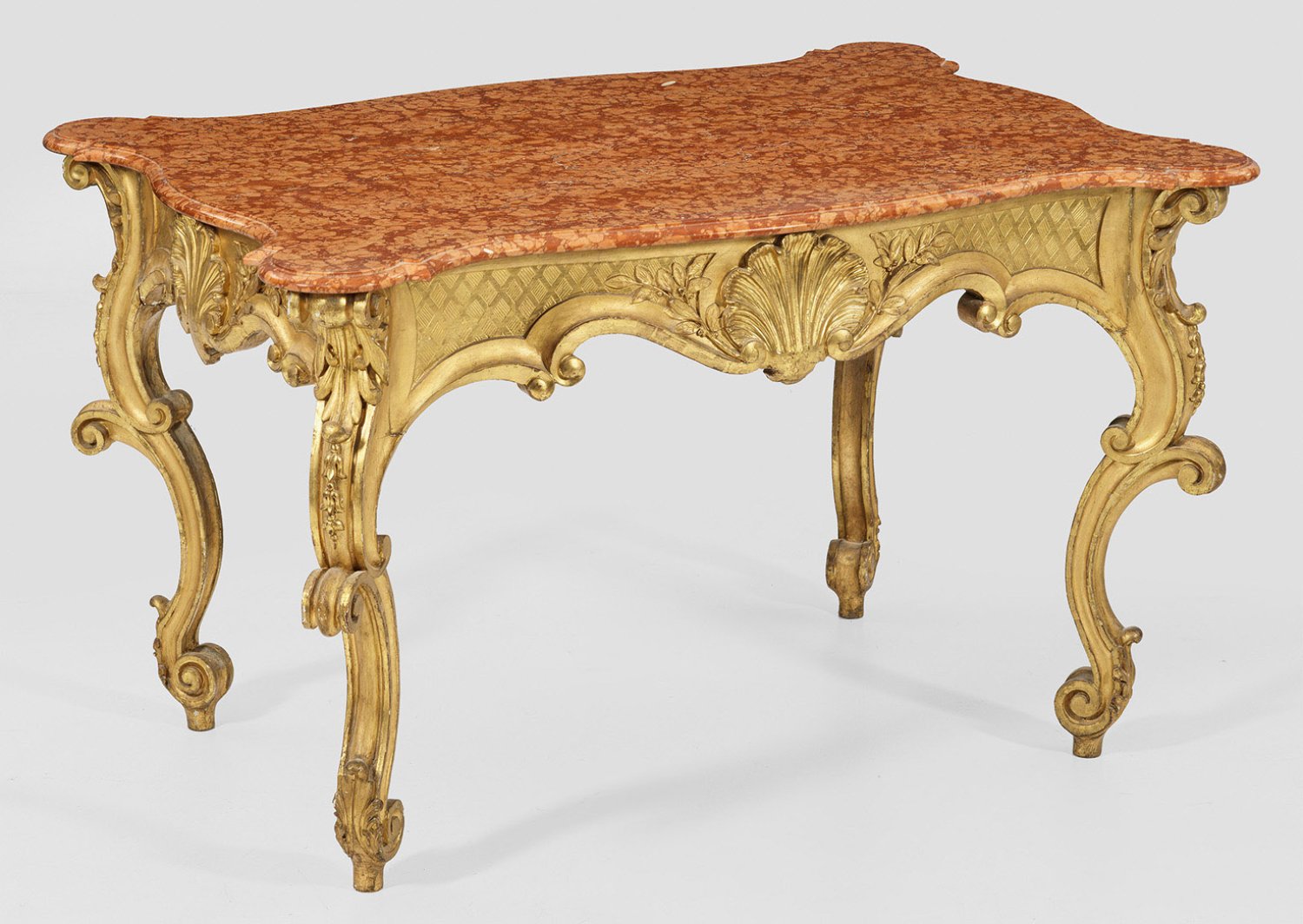 Holz, geschnitzt, gefasst und vergoldet. Passig geschweifte Zarge mit reliefiertem Gitterwerk und plastischem Muscheldekor auf kräftigen Beinen aus gegeneinander gestellten Voluten. Weit überstehende, profilierte Deckplatte mit verkröpften Ecken aus sog. rosa Tea-Marmor. H. 78 cm. 130 cm x 90 cm.