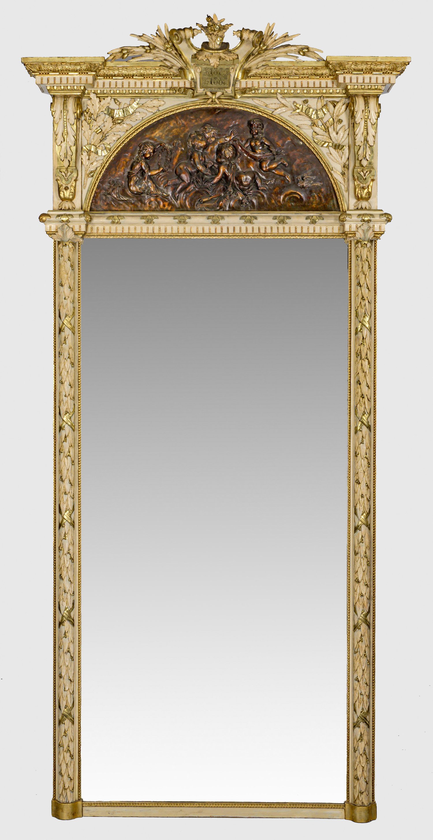 Holz, stuckiert, creme- bzw. bronzefarben gefasst und teilw. vergoldet. Gerade hochrechteckige Spiegelrahmung flankiert von eingestellten Halbsäulen aus reliefplastisch gestaltetem Lorbeerblatt. Oberhalb segmentförmiges Giebelfeld mit szenisch angelegter Puttendarstellung, umgeben von Eichblatt. Blattvoluten als Stützen für vorkragendes Profilgesims mit Kartuschenbekrönung. Bez 3/6 1875 sowie 3/12 1887. Facettiertes Spiegelglas. H. 280 cm x 132 cm.