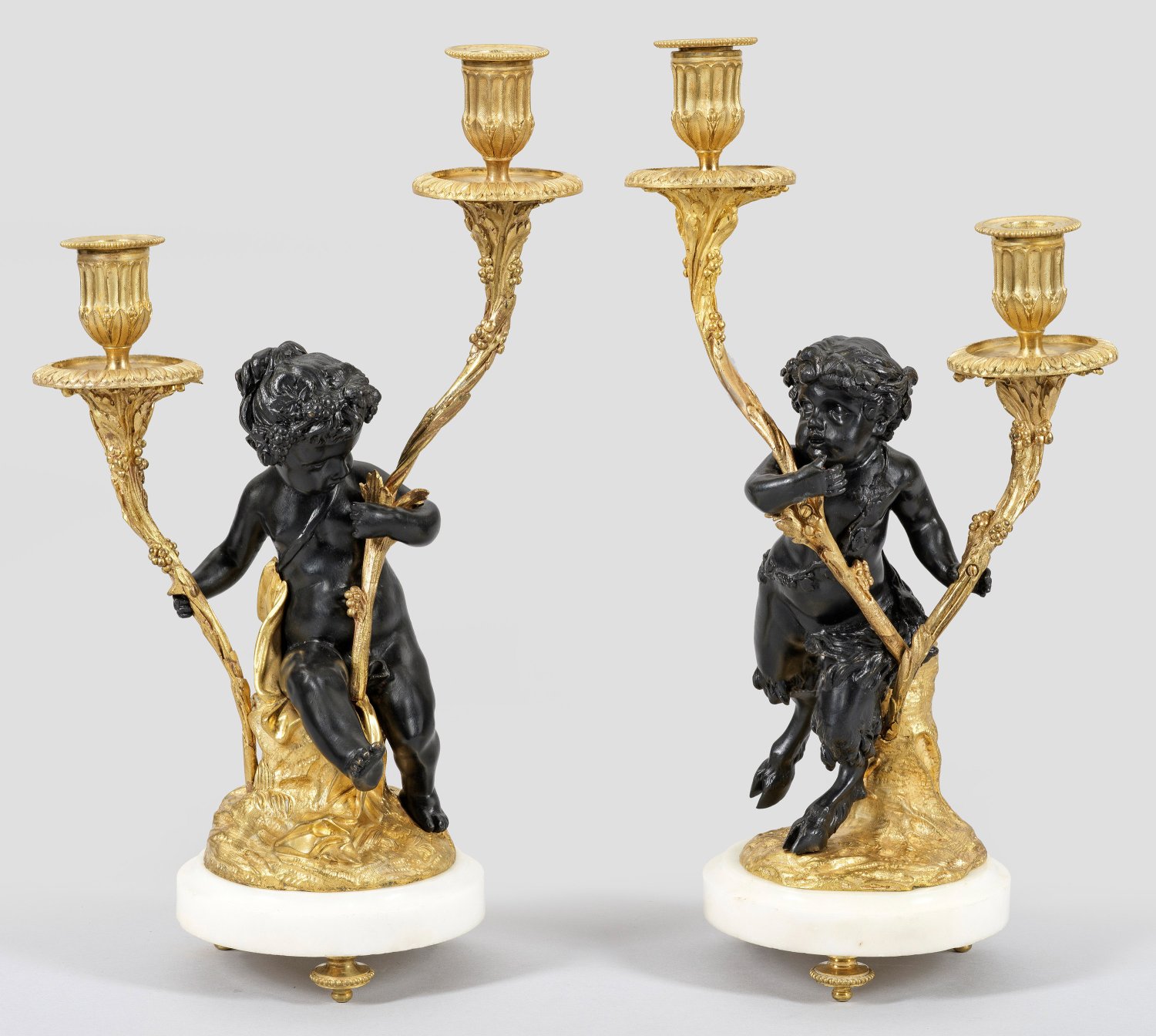 Gegenstücke. 2-flg.; Bronze, vergoldet und teilw. schwarz lackiert sowie weißer Marmor. Über profilierter Basis auf Balusterfüßen naturalistisch gestalteter Baumstumpf sowie vollplastisch gestalteter Satyrknabe und Amorette als Träger für Leuchtmittel aus geschwungenen Leuchterarmen mit vasenförmigen Tüllen. H. 41 cm.