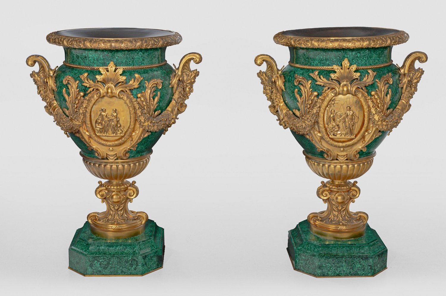 Flächendeckender Fond aus fein gemasertem Malachit in unterschiedlichen Grüntönen sowie vergoldete Bronze. Über oktogonalem, umlaufend profiliertem Sockel, balusterförmiger Korpus mit blattreliefierter Basis, flankiert von Volutenspangen. Seitlich große Volutenkartuschen mit reliefplastischen Bacchantenmaskarons, durch üppige Festons aus erhaben reliefiertem Eichblatt verbunden. Beidseitig der Wandung große, von üppigem Blattwerk umgebene Medaillons mit szenisch angelegten Darstellungen zweier unterschiedlicher Allegorien. Umlaufend profilierter, leicht vorkragender Lippenrand aus reliefierten Volutenspangen und Palmetten. H. 95 cm.