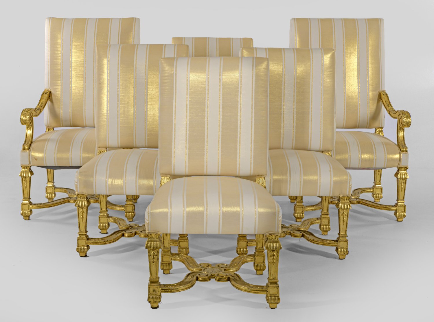 6-tlg.; Zwei Armlehnsessel und vier Stühle. Holz, geschnitzt, gefasst und vergoldet. Trapezförmige Zarge auf gekanteten Balusterbeinen, unterhalb durch breite, geschwungene Stege verbunden. Korrespondierende Stützen für breite, geschweift ansteigende Armlehnen. Hohe, rechteckige Rückenlehnen, allseitig gepolstert und bezogen. Sitz-H. 50 cm.