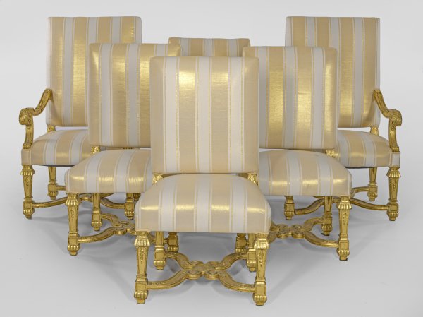 A set of French gilt wood Louis XIV style dining chairs.