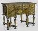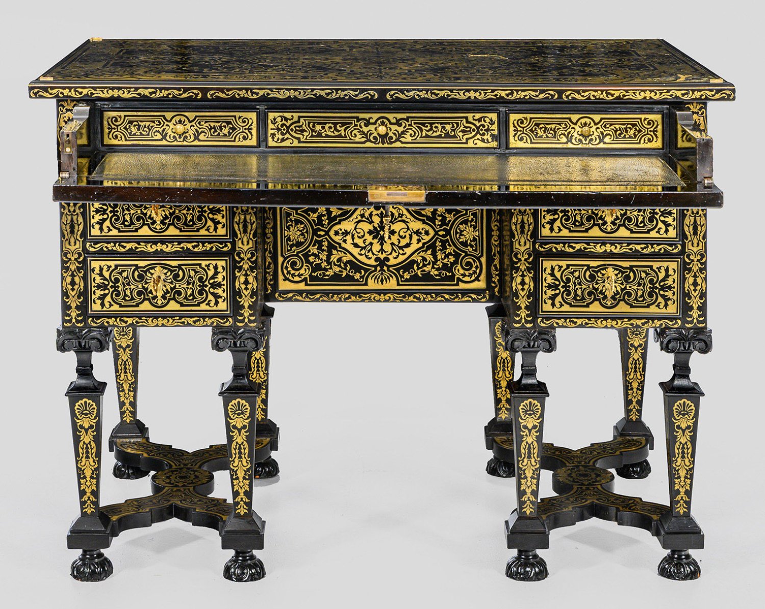 Flächendeckender Fond aus Schwarzlack mit reichen Einlagen aus ornamentiertem Messing in sog. Partie- et Contrepartie Boulle-Technik. Querrechteckig angelegter Korpus aus konischen, gekanteten Balusterbeinen mit stilisierten, ionischen Kapitellen, unterhalb durch breite, geschwungene und kreuzförmig angelegte Stege verbunden. In der gegliederten Front gekantetes Kniefach mit zurückgesetzter Lade, flankiert von je zwei Schubfächern. Oberhalb breite, auszieh- und abklappbare Arbeitsfläche mit Schubladeneinteilung. Rückseitig korrespondierende Blendschubladen. Gering überstehende Deckplatte. Allseitig aufwändige Einlagen aus großen, passig geschweiften, breit gerahmtes Reserven sowie feinen Blattranken und Voluten. H. 80 cm. 109 cm x 64 cm.