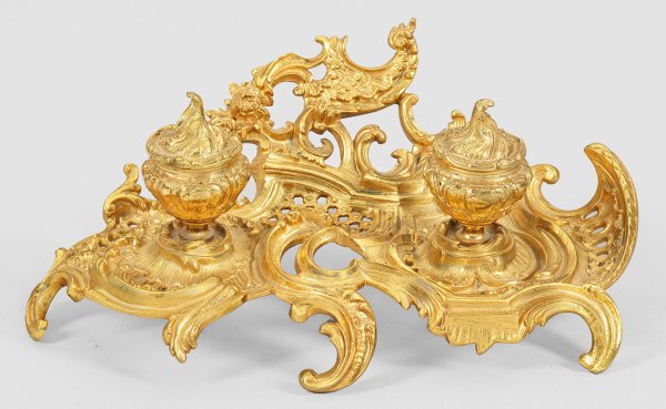 Messing, vergoldet. Asymmetrisch angelegter, durchbrochen gearbeiteter Korpus aus üppigen Rocaillen und Gitterwerk. Balusterförmige Behältnisse für Tinte und Streusand. Einsätze fehlen. H. 12 cm. 33 cm x 20,5 cm.