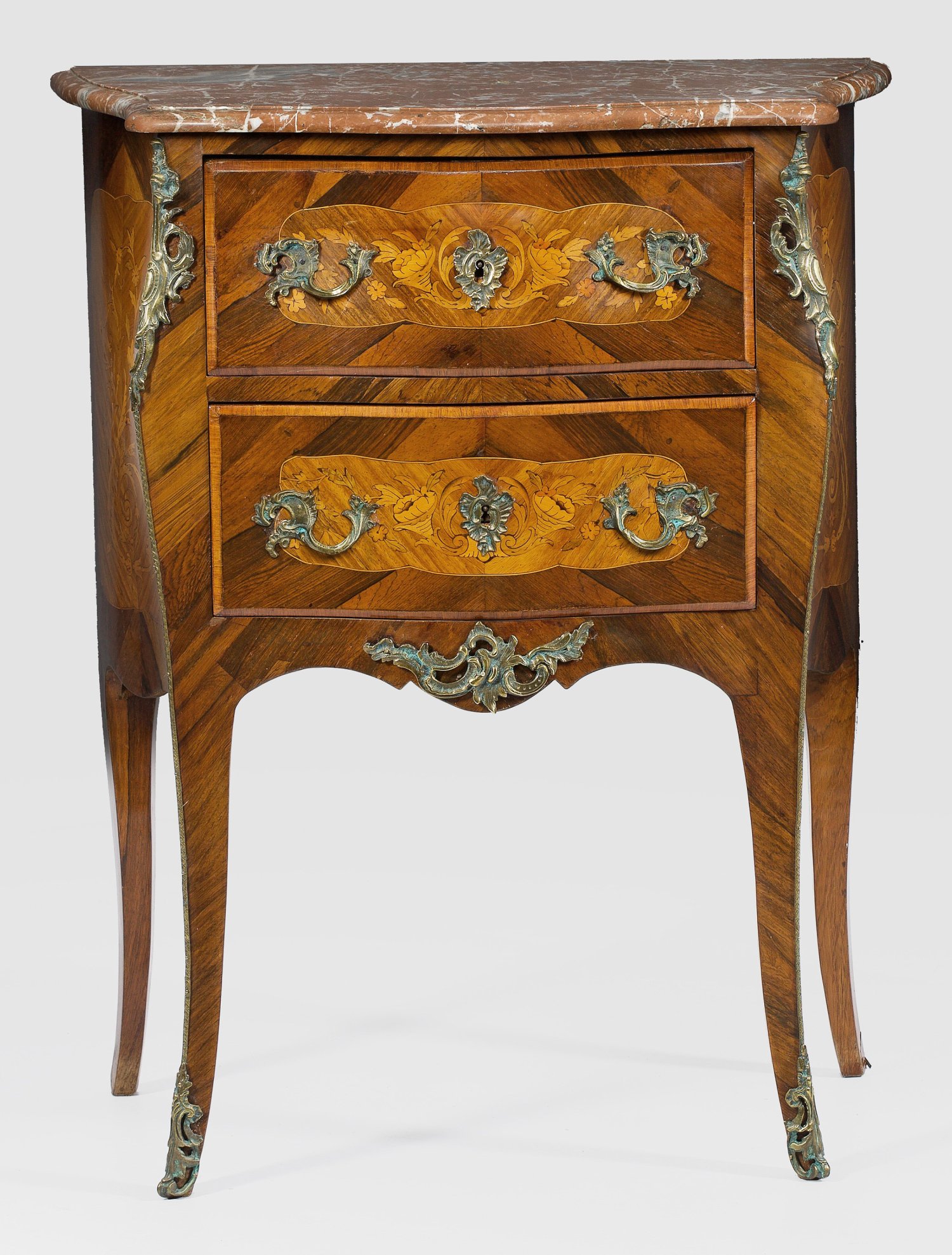 Palisander und Rosenholz, furniert sowie Einlagen aus unterschiedlichen Hölzern. Dreiseitig bombierter Korpus, flankiert von schmalen, ausgezogenen Ecklisenen, in hohe, leicht konische Beine übergehend. In der gegliederten Front zwei Schubfächer. Flächendeckend breit gerahmte, gespiegelt angeordnete Furnierfelder mit Blütenintarsien. Bez. HÖRR. Gering überstehende Deckpllatte aus rotem, weiß gemasertem, unw. besch. Marmor. H. 87 cm. 70 cm x 40,5 cm.