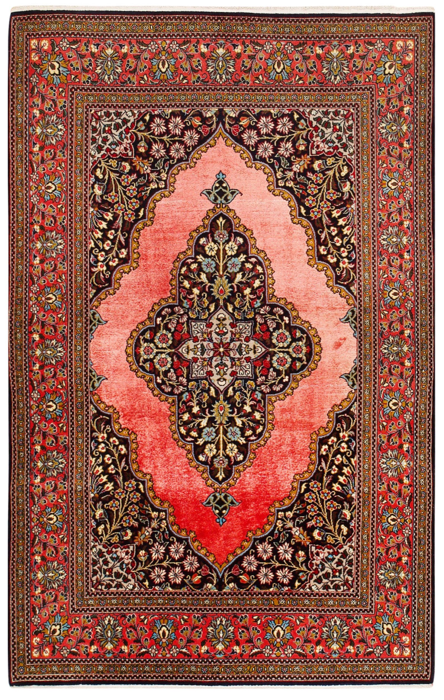Persien. Wolle und Seide auf Baumwolle. Im lachsfarbenen Spiegel gestrecktes, dunkelgrundiges Zentralmedaillon mit Blütendekor sowie korrespondierende Ecklösungen. Umlaufend rotgrundige Palmettenbordüre. Fehlstellen. 164 cm x 105 cm.