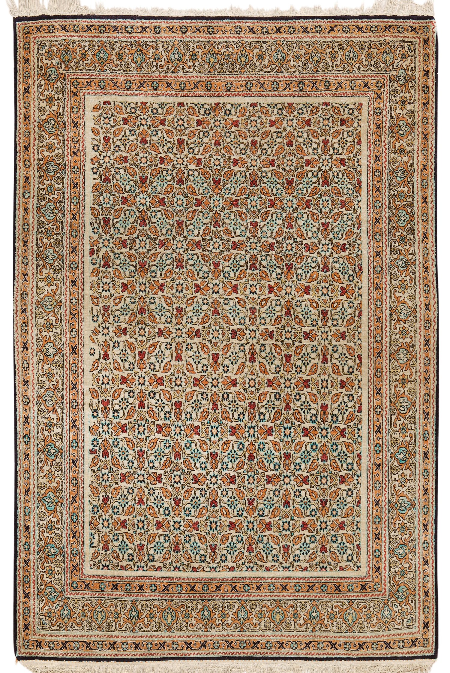 Persien. Seide auf Seide. Im elfenbeinfarbenen Innenfeld dichte Musterung aus zusammenhängenden Arabesken und Blüten sowie Rot-, Blau- und Beigetönen. Umlaufend breite, korrespondierende Bordüre aus Palmetten und Blattranken. 160 cm x 103 cm.