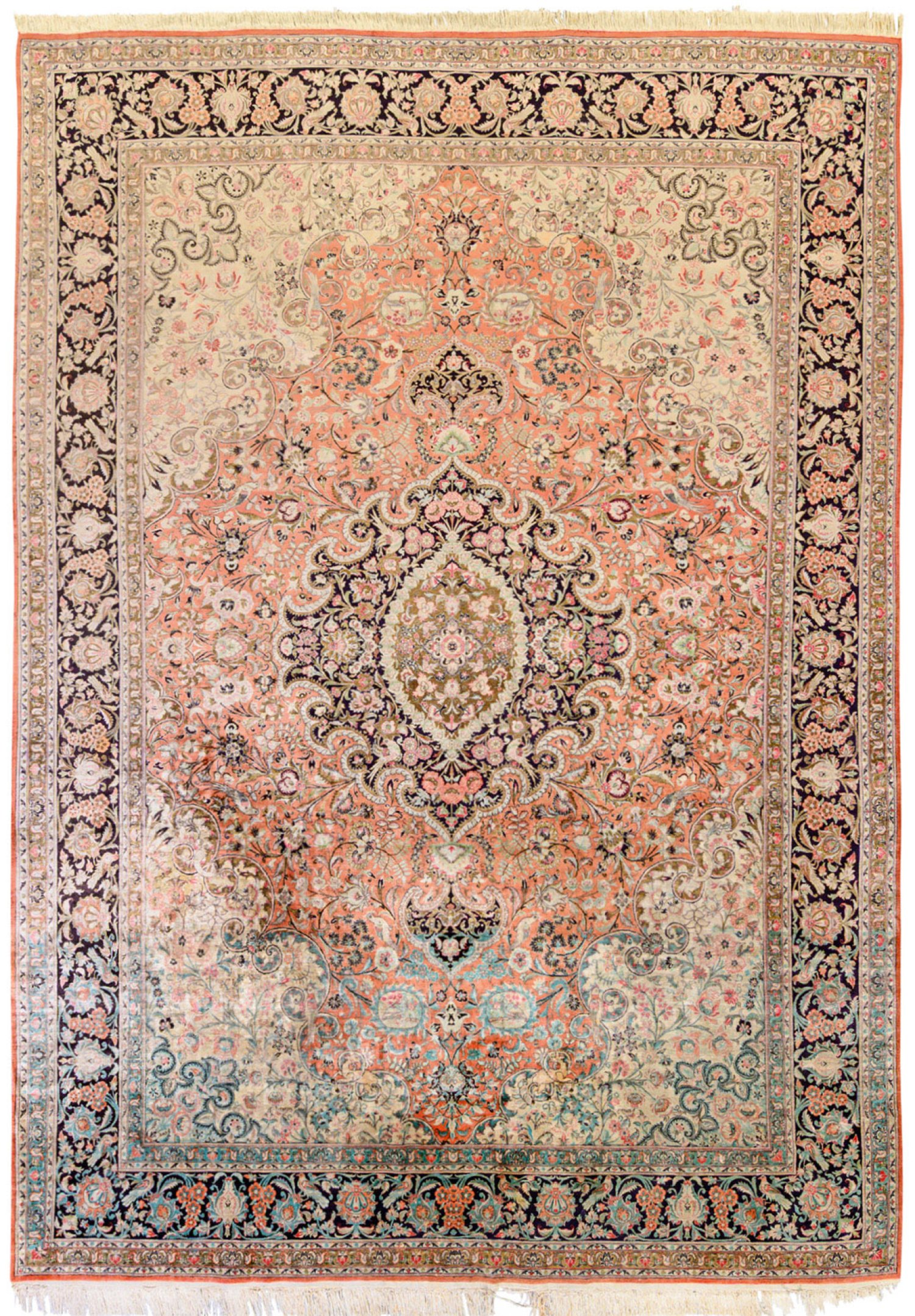 Persien. Seide auf Seide. Im roséfarbenen Innenfeld großes, dunkelgrundiges Zentralmedaillon mit Anhängern sowie breite, cremefarbene, passig geschweifte Ecklösungen. Umlaufend dunkelgrundige Palmettenbordüre, begrenzt von schmalen Bändern. 305 cm x 413 cm.