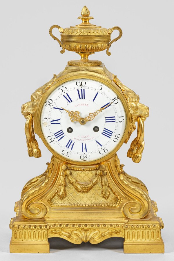 Bronze, vergoldet. Über gekantetem Sockel geschweift ansteigende Basis aus eingerollten Voluten und Gitterwerk als Träger für rundes Uhrengehäuse, flankiert von plastischen Löwenmaskarons mit Vasenbekrönung. Verglastes, besch. Emailzifferblatt, bez. Gasnier à Paris. Pendulenwerk mit Pendelfeder sowie Halbstundenschlag auf Glocke. Platine bez. LaGarde à Paris. H. 41 cm. 25 cm x 14 cm.
