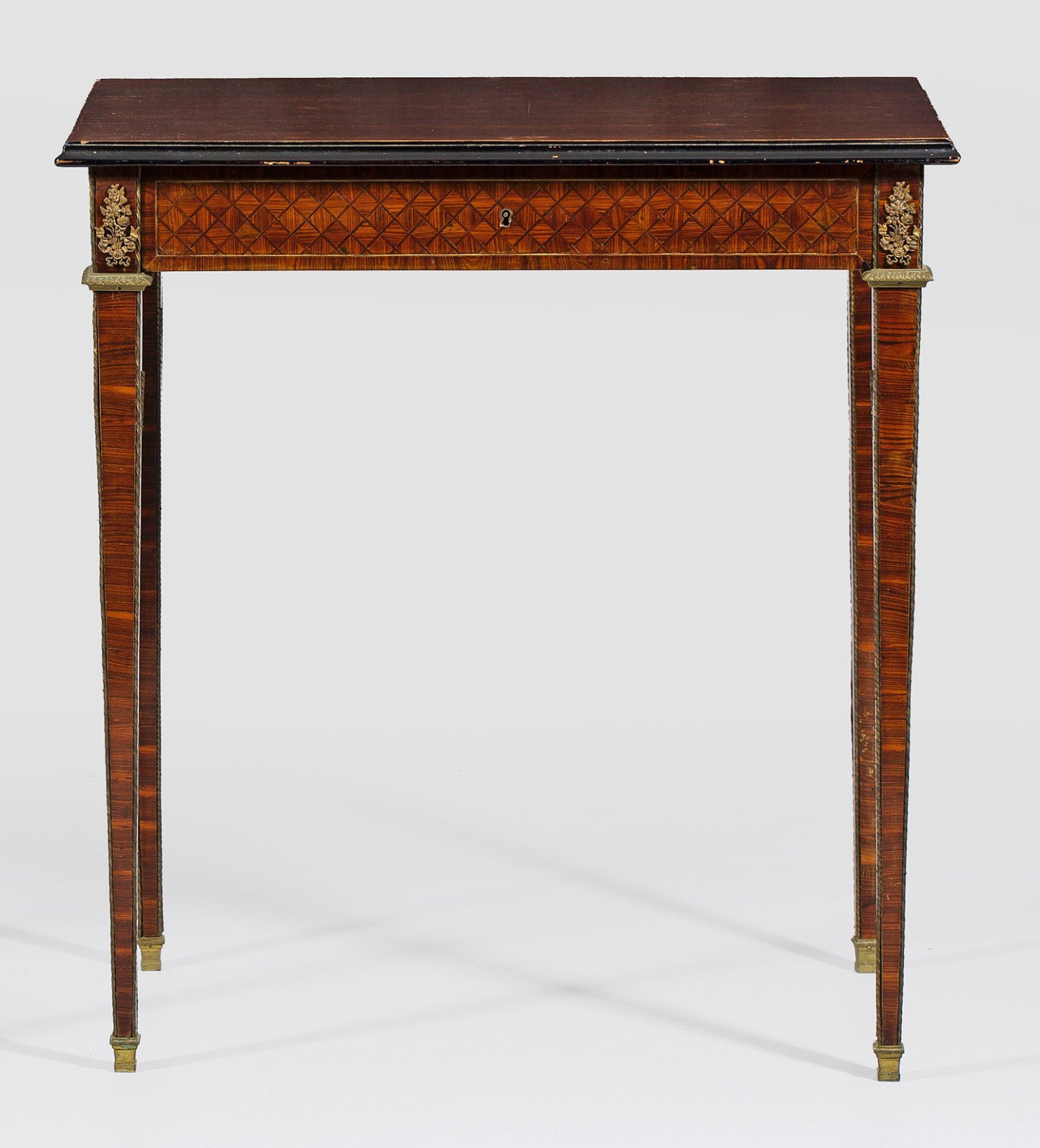 Palisander, furniert. Gerader, einschübiger Zargenkasten auf hohen, konischen Beinen. Gering überstehende, profilierte Deckplatte. Flächendeckende Furnierfelder aus Gitterwerk bzw. Fischgratbahnen. Applikationen aus Bronze. H. 78 cm. 72 cm x 48,5 cm.