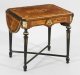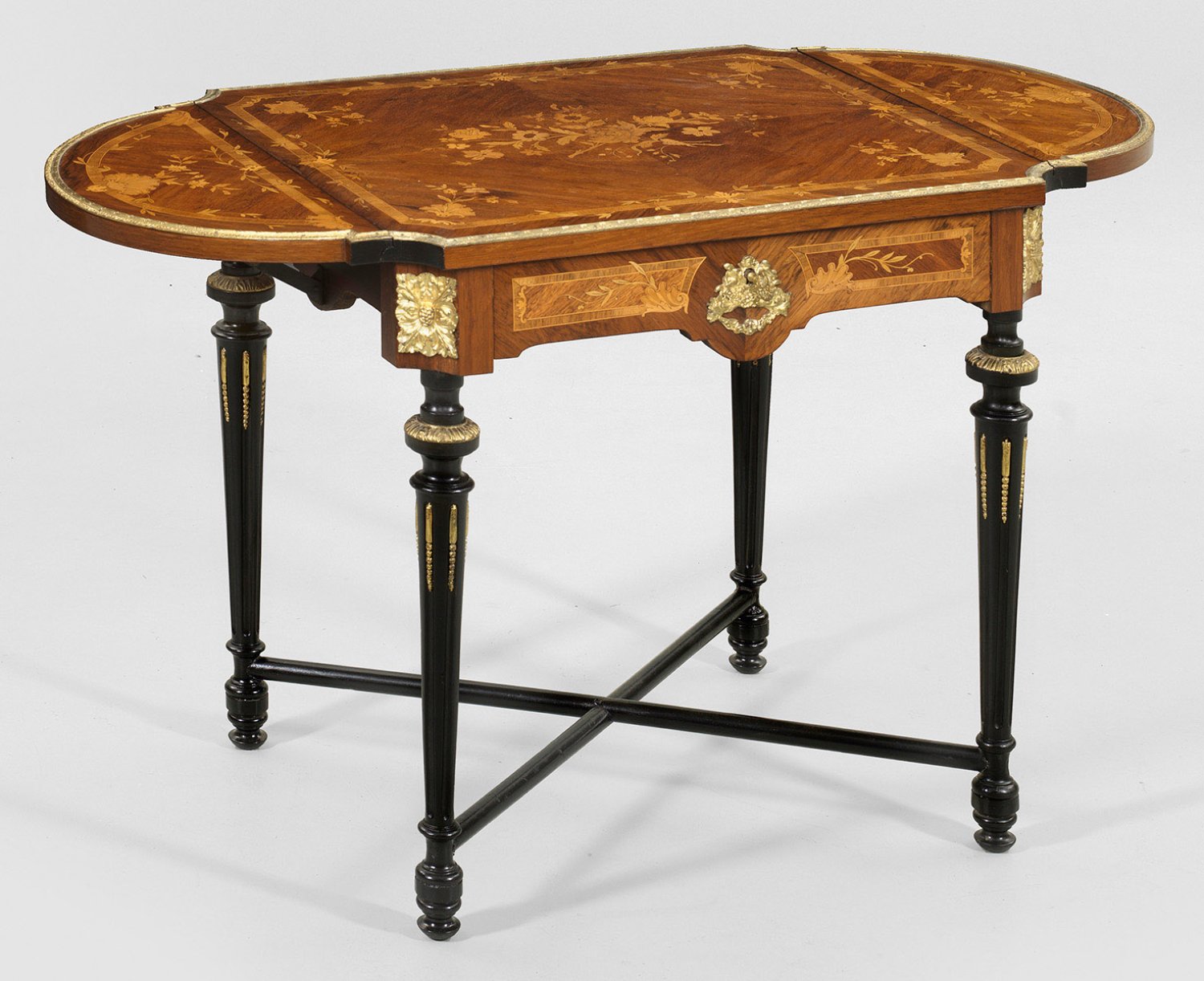 Palisander, furniert mit reichen Einlagen aus unterschiedlichen Edelhölzern sowie ebonisiert. Gerader, einschübiger Zargenkasten mit schräggestellten Ecken auf kannelierten Balusterbeinen, durch Rundstäbe verbunden. Korrespondierende, seitlich aufstellbare Deckplatte. Breit gerahmte Furnierfelder sowie reicher Dekor aus Blütengebinden und Muschelwerk. Applikationen aus vergoldeter Bronze. H. 67 cm. 70/111 cm x 56 cm.