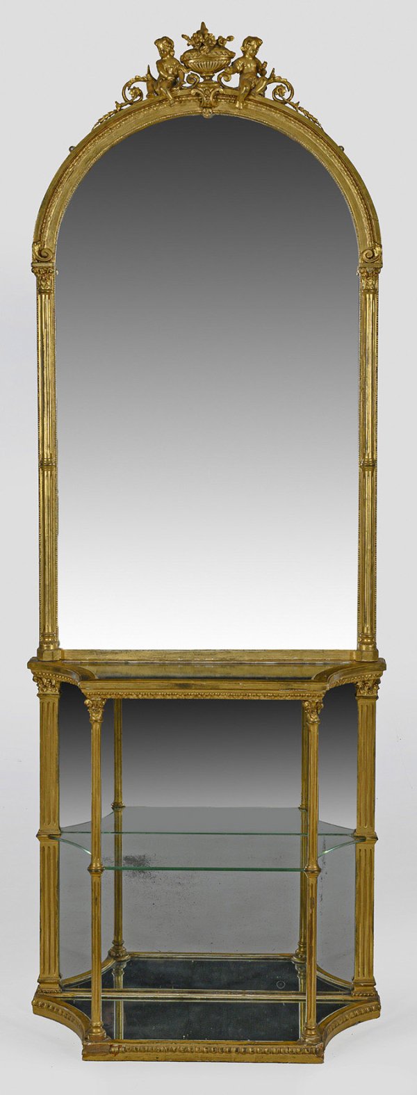 Holz, stuckiert, gefasst und vergoldet. Gerade, hochrechteckige Spiegelrahmung, flankiert von eingestellten Halbsäulen mit segmentförmigem oberen Abschluss sowie plastischer Bekrönung in Gestalt eines Puttenpaares. Unterhalb korrespondierende, verspiegelte Konsole. Spiegel 155 cm x 82 cm. Konsolen-H. 87 cm. 86 cm x 33 cm.