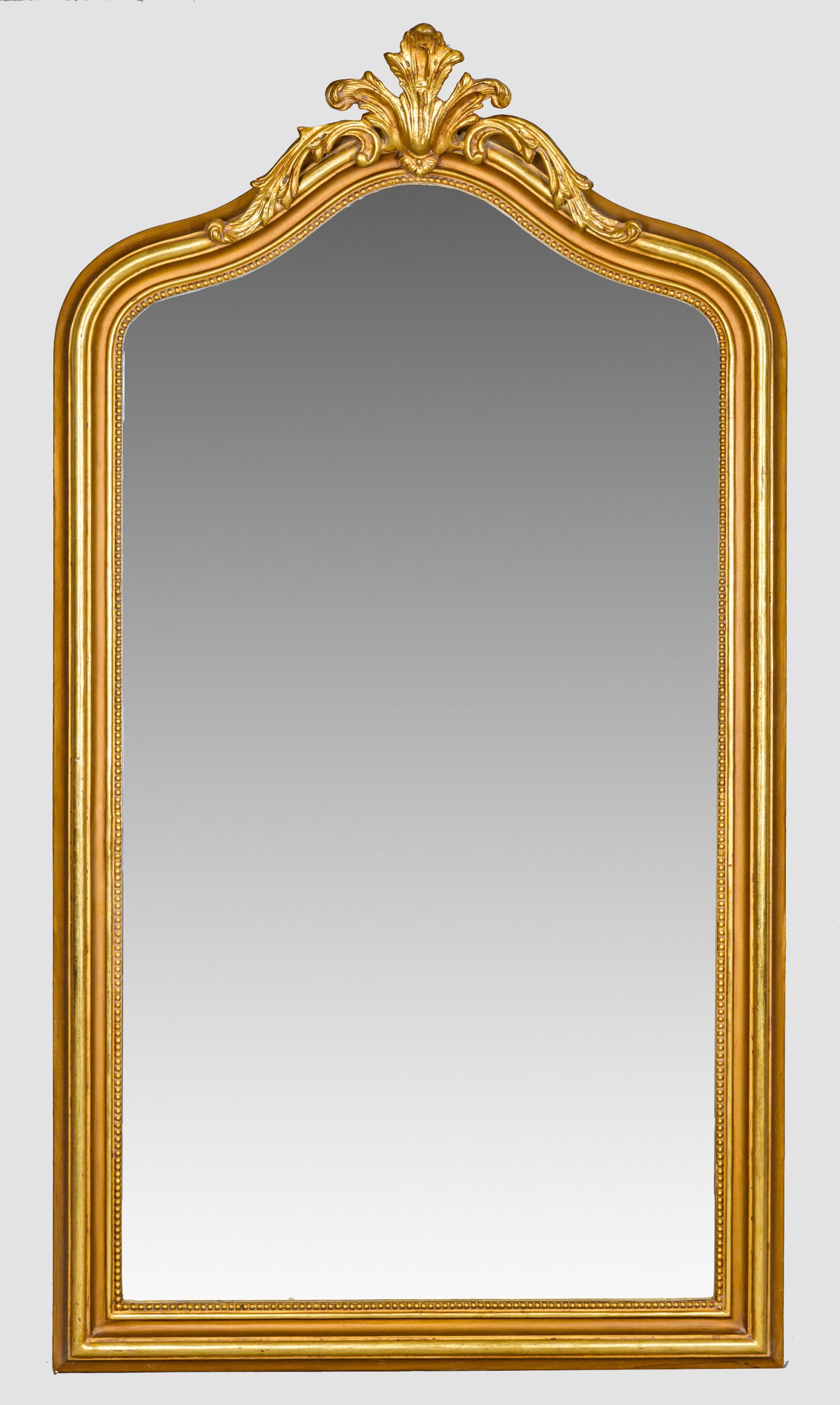Holz, stuckiert und vergoldet. Gerade, hochrechteckige, umlaufend profilierte Spiegelrahmung mit Perlstab sowie geschweift ansteigendem oberen Abschluss. Durchbrochen gearbeitete Bekrönung aus großer Blattkartusche. Facettiertes Spiegelglas. H. 180 cm x 100 cm.