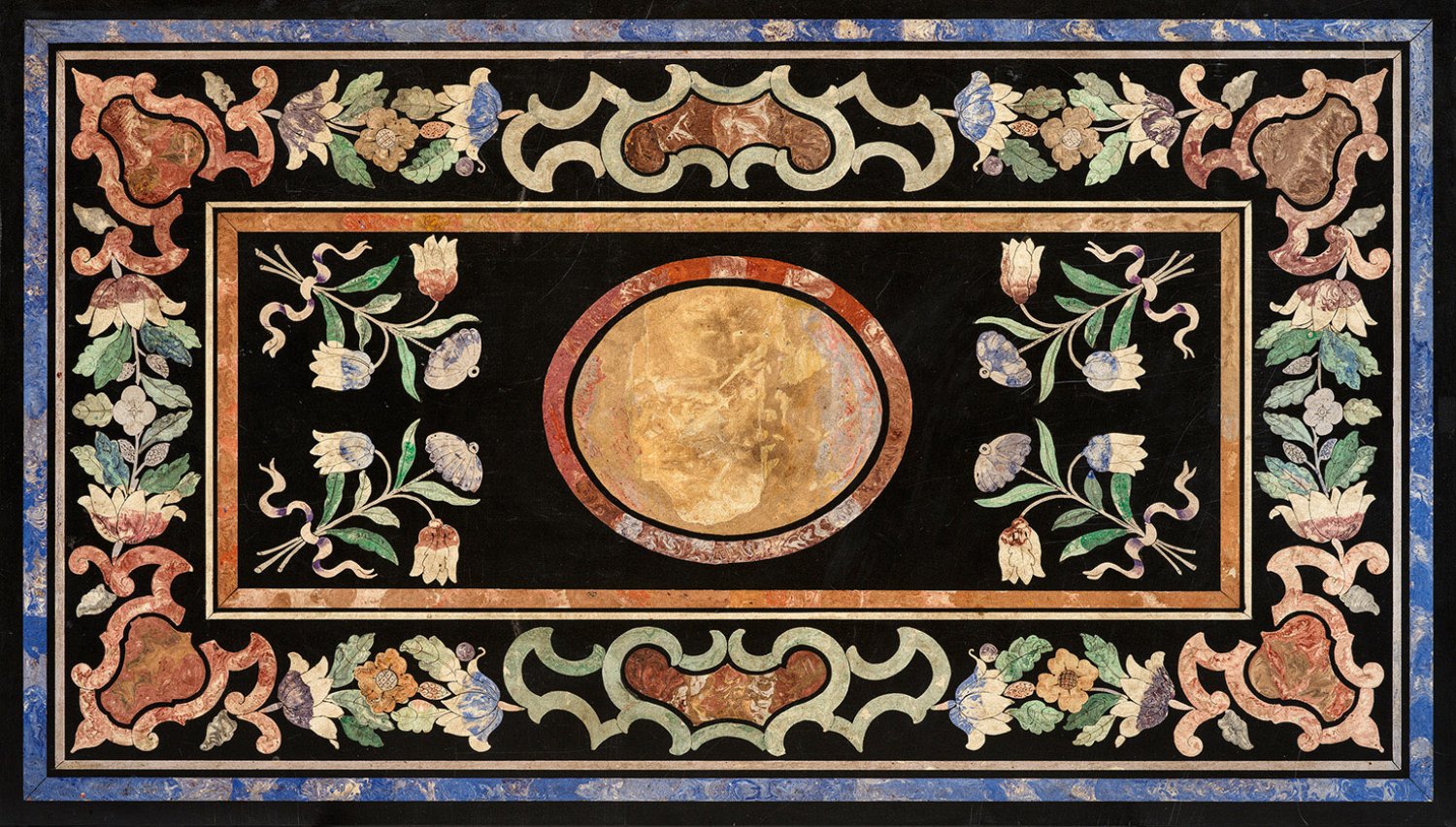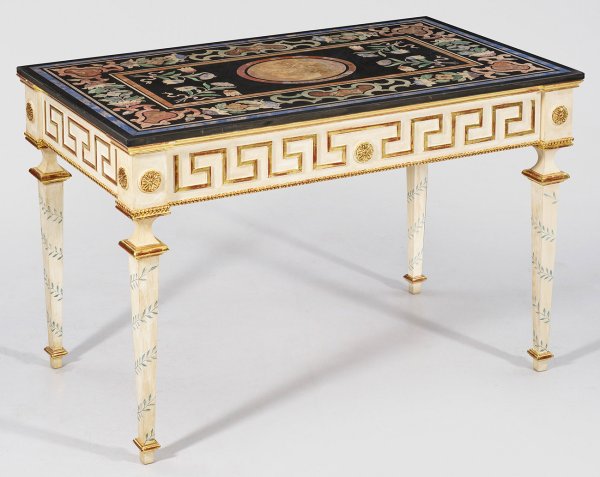 Holz, weiß gefasst und teilw. vergoldet bzw. polychrom floral staffiert. Gerade Zarge, allseitig mit breitem Mäanderfries auf hohen, konischen Vierkantbeinen. Gering überstehende Deckplatte aus sog. Scagliola Stuckmarmor. Auf dunklem Fond in unterschiedlichen Beige- und Rottönen gemaserte Reserve, umgeben von breiter Blütenbordüre aus unterschiedlichen Grün-, Blau- und Rosétönen. Minim. besch.; H. 92 cm. 140 cm x 80 cm.
