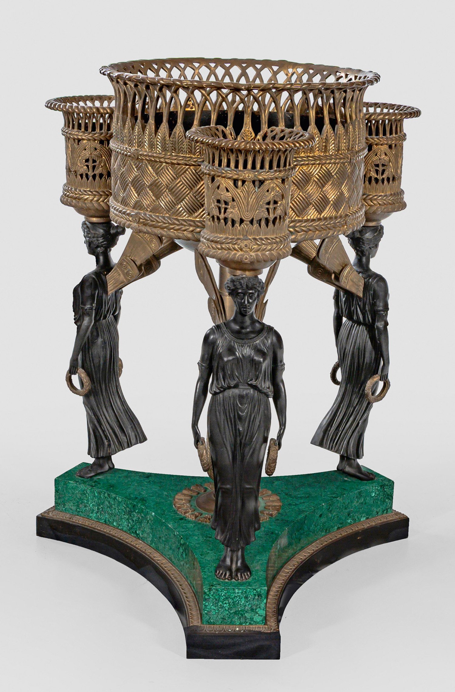 Bronze, teilw. dunkel patiniert sowie flächendeckender Fond aus in unterschiedlichen Grüntönen fein gemasertem Malachit, über dreiseitig konkav eingezogener Sockelplatte mit umlaufendem Palmettenfries. Vollplastisch gestaltete Viktorienfiguren und zentraler, leicht konisch verlaufender Balusterschaft als Träger für zylinderförmigen, korbähnlich reliefierten sowie entsprechend durchbrochen gearbeiteten Korpus mit Pflanzeinsatz, flankiert von korrespondierenden Behältnissen. H. 91 cm.