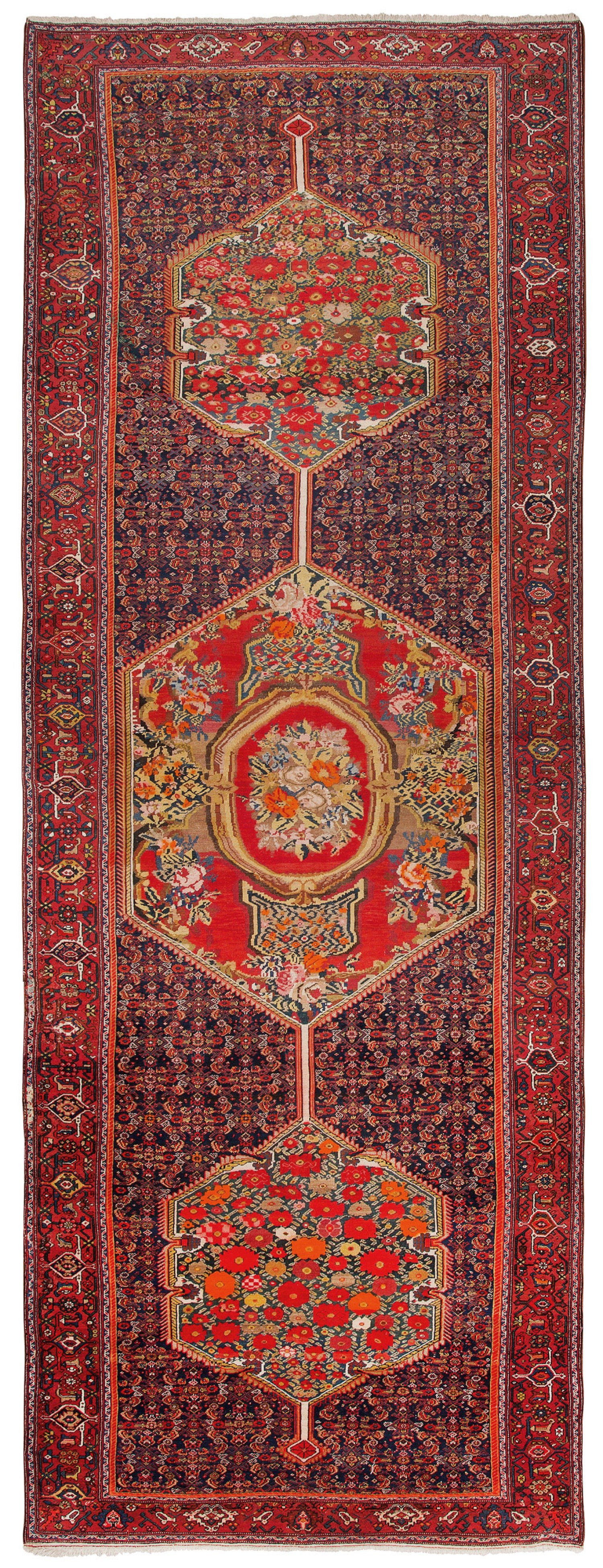 Persien. 1. Hälfte 20. Jh.; Wolle auf Baumwolle. Auf dunklem Fond flächendeckende Heratimusterung aus Blattwerk und Rauten im Rapport sowie große, durch schmale Stege verbundene, hellrote Rautenmotive. Umlaufend rotgrundige Bordüre mit Palmetten. Teilw. rest.; 220 cm x 666 cm.