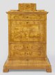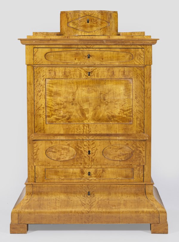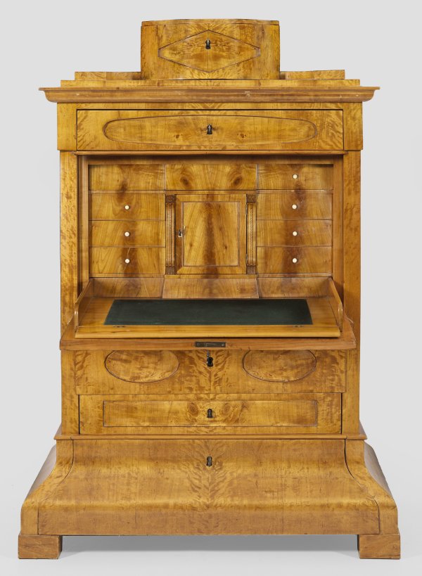 Birkenholz, furniert. Über geschweift ansteigendem, einschübigem Sockel und gekanteten Füßen, hochrechteckiger Korpus. In der gegliederten Front drei Schubladen unterschiedlicher Größe sowie abklappbare Arbeitsfläche. Dahinter gestaffelte Facheinteilung mit ausziehbarer Schreibfläche sowie Knäufen aus Elfenbein. Oberhalb bombierter, einschübiger Abschluss. Altersspuren. H. 170 cm. 121 cm x 64 cm. CITES-Bescheinigung liegt vor.