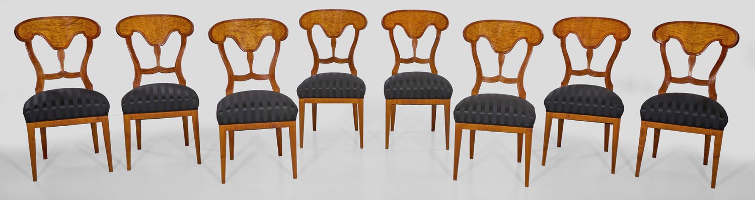 A set of eight cherry- and birchwood veneered Biedermeier style dining chairs. Restored.