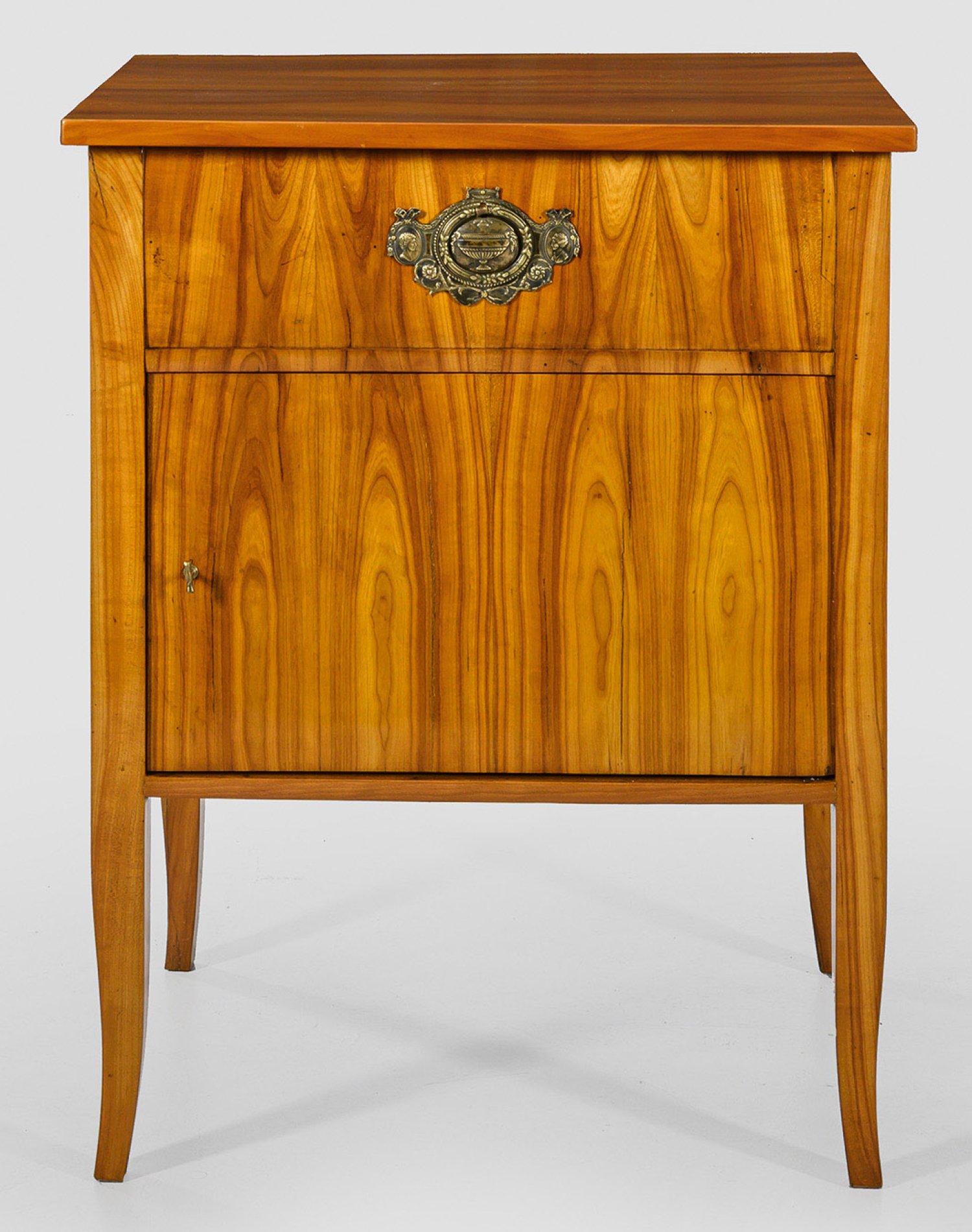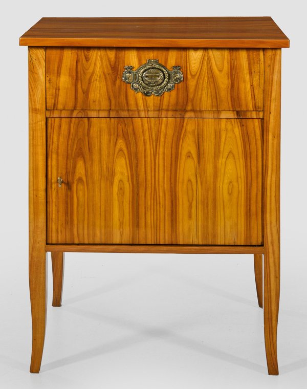 Kirschbaum, furniert. Gerader, rechteckiger Korpus auf hohen, gekanteten, leicht ausgestellten Vierkantbeinen. In der gegliederten Front flache Tür sowie oberhalb feststehende Blendschublade. Gering überstehende Deckplatte. Rest. mit Erg.; H. 79,5 cm. 62 cm x 47,5 cm.