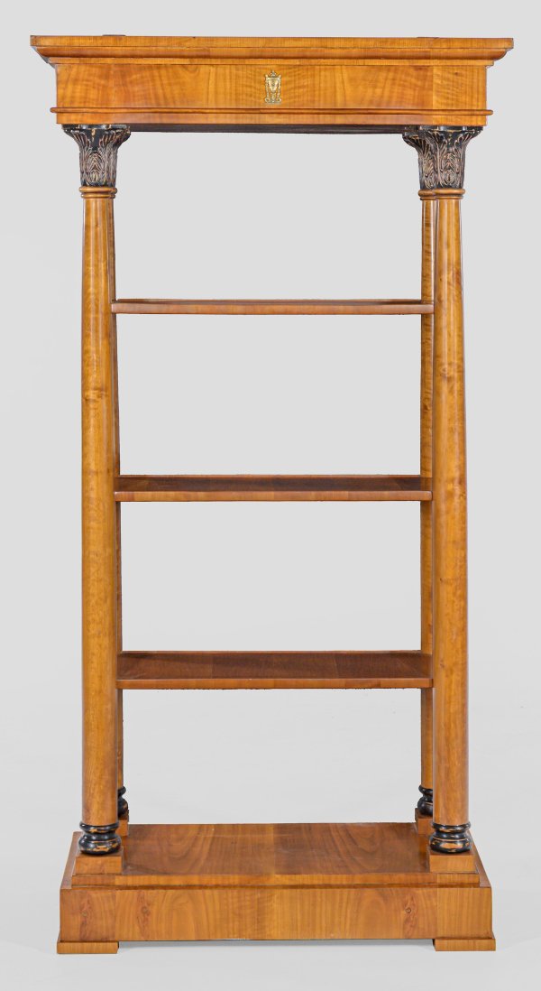 Kirschbaum, furniert. Gerader, rechteckiger Sockel auf flachen Scheibenfüßen. Oberhalb davon ausgehend konische Vollsäulen mit reliefierten Basen und Kapitellen als Träger für Ablageflächen. Korrespondierender Gesimsabschluss mit verdeckter Lade. H. 181 cm. 96 cm x 55 cm.